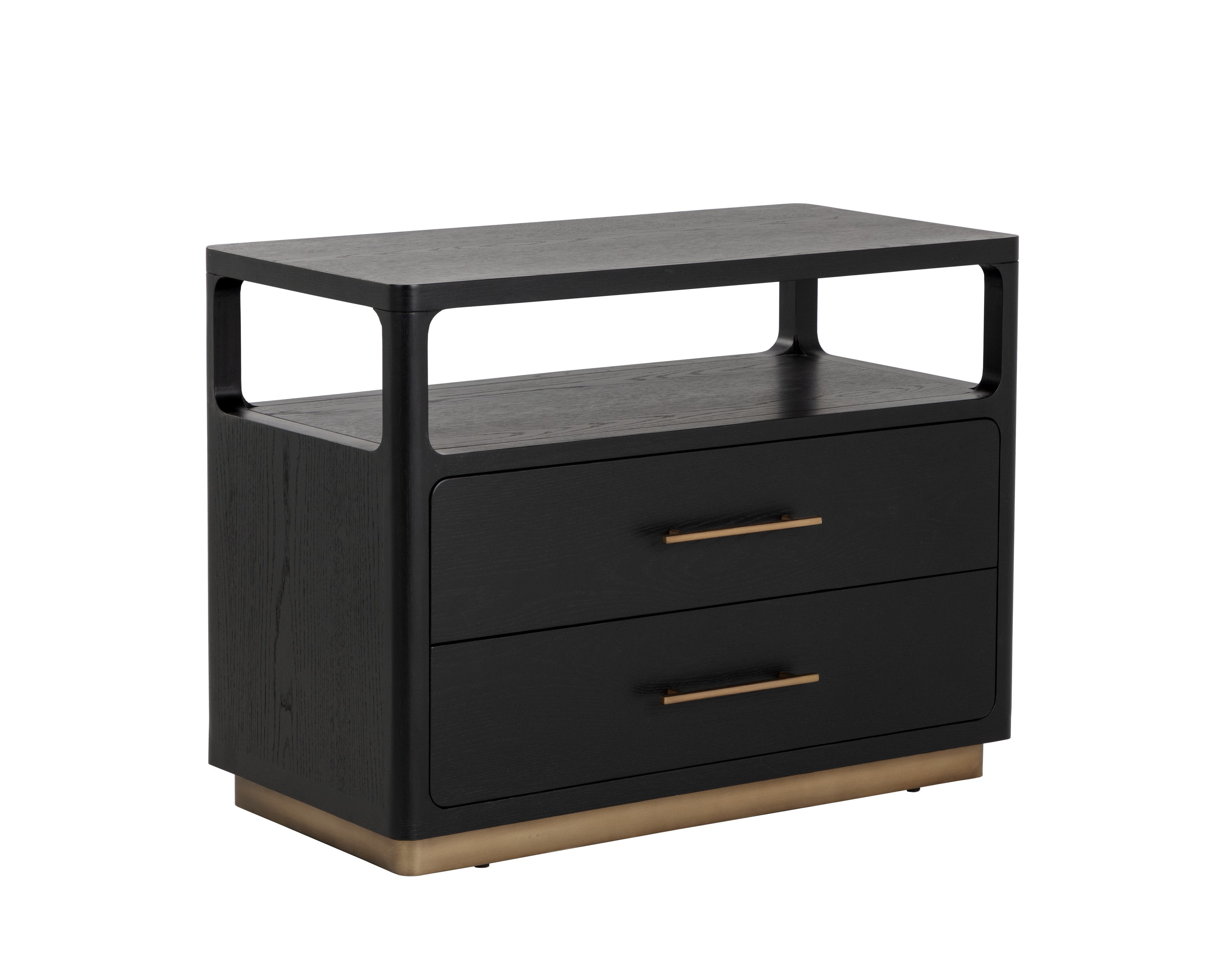 - Plinth base and drawer handles crafted from steel in a warm brass brushed finish.