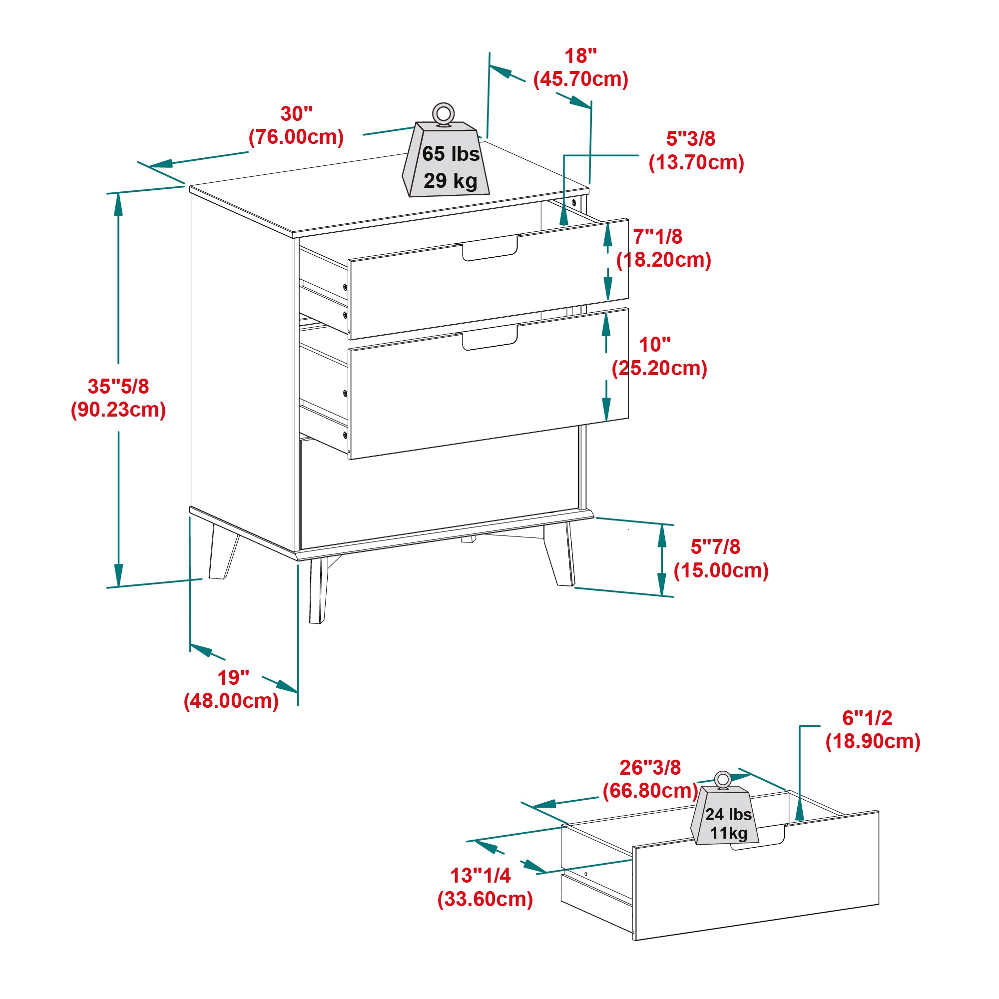 - Dimensions: BR3DSLDRNP-T 3-Drawer Groove Handle Solid Wood Dresser - 35.63" H x 30" L x 19" W