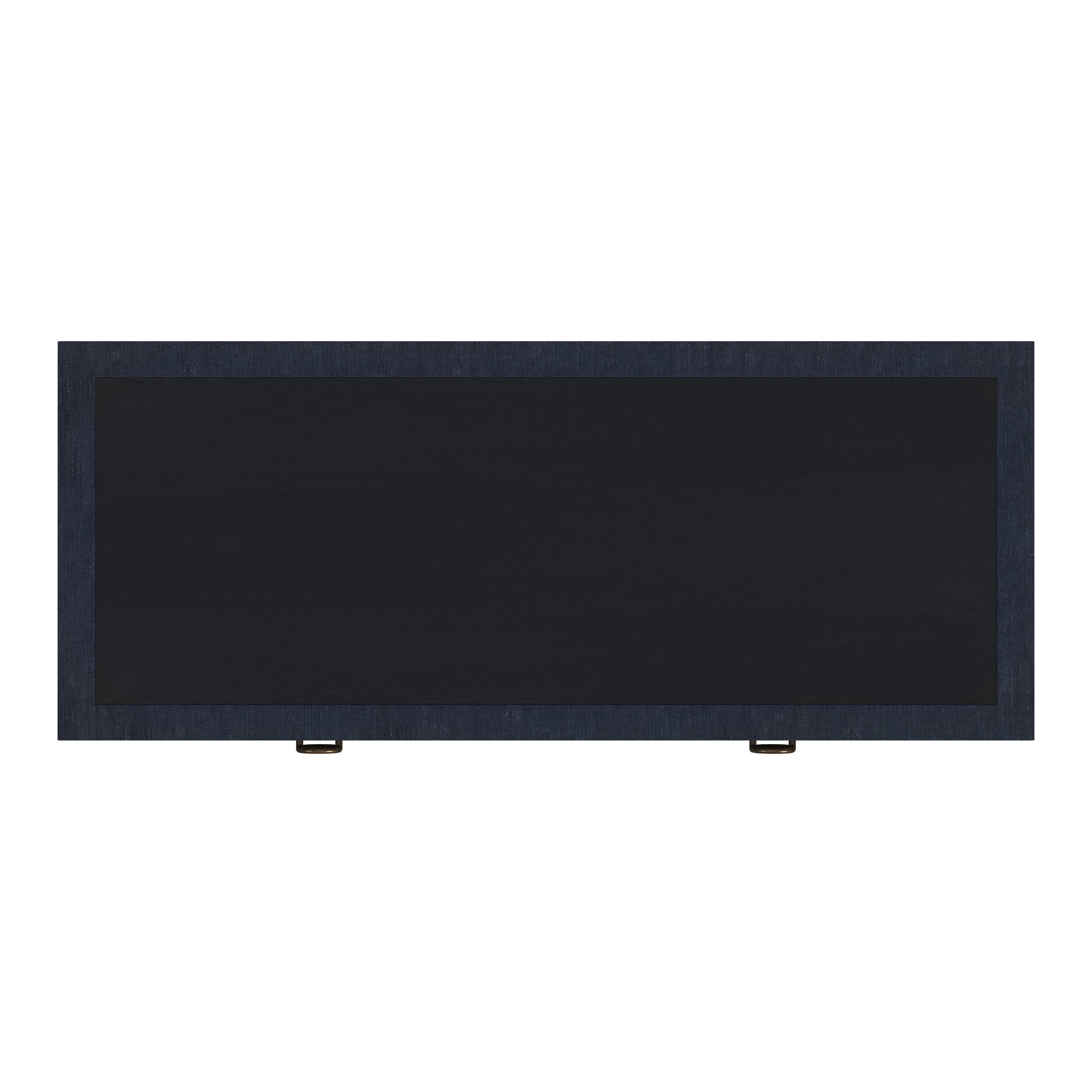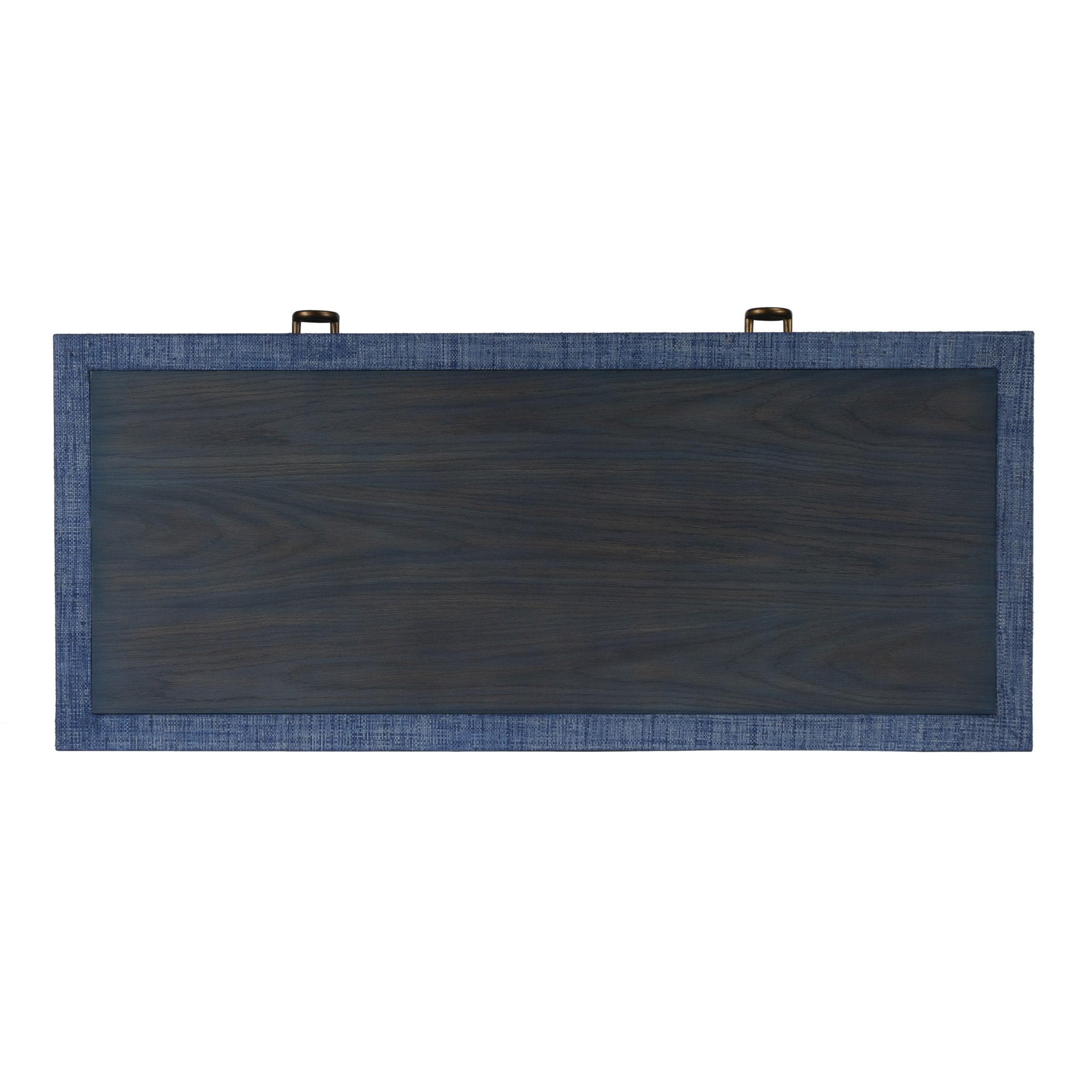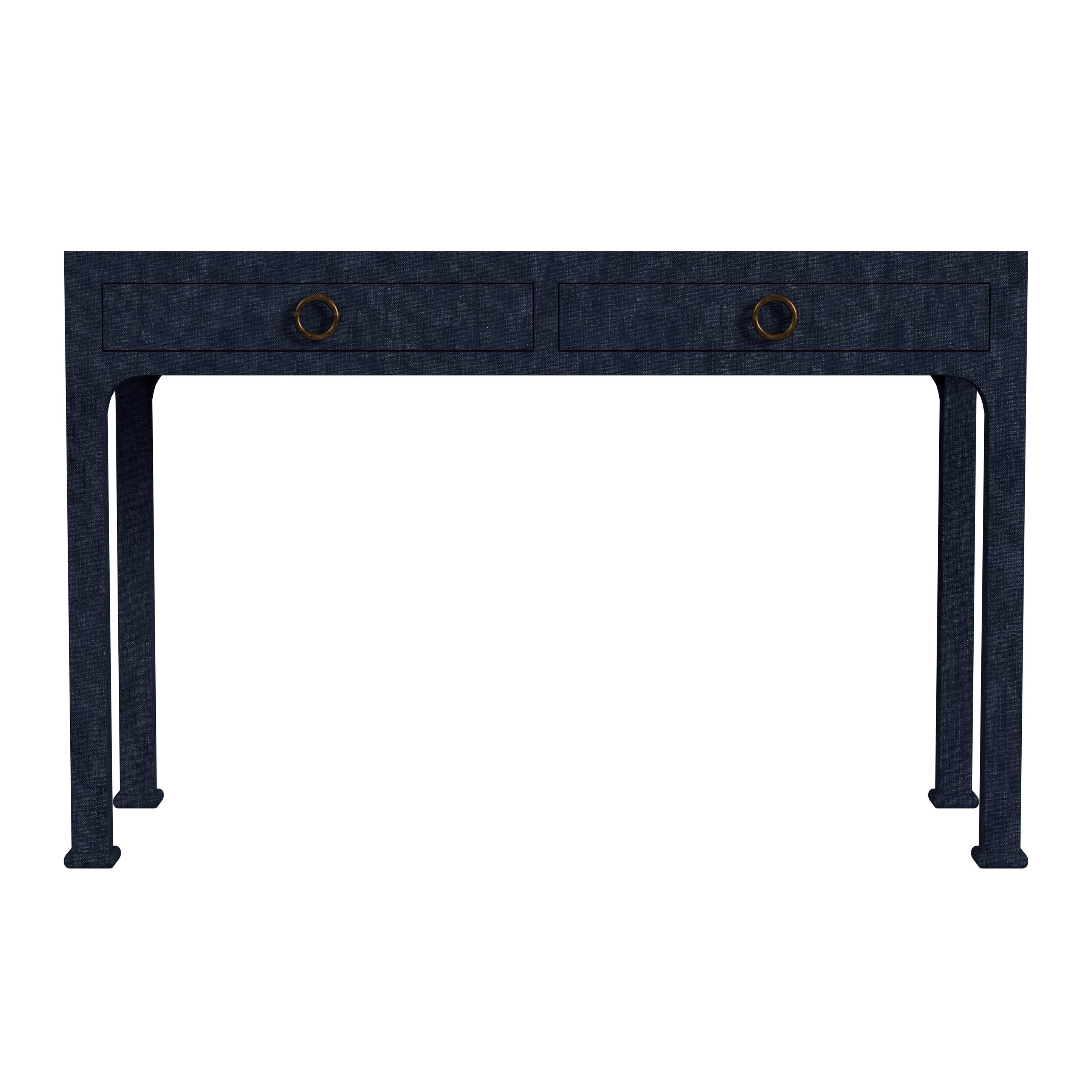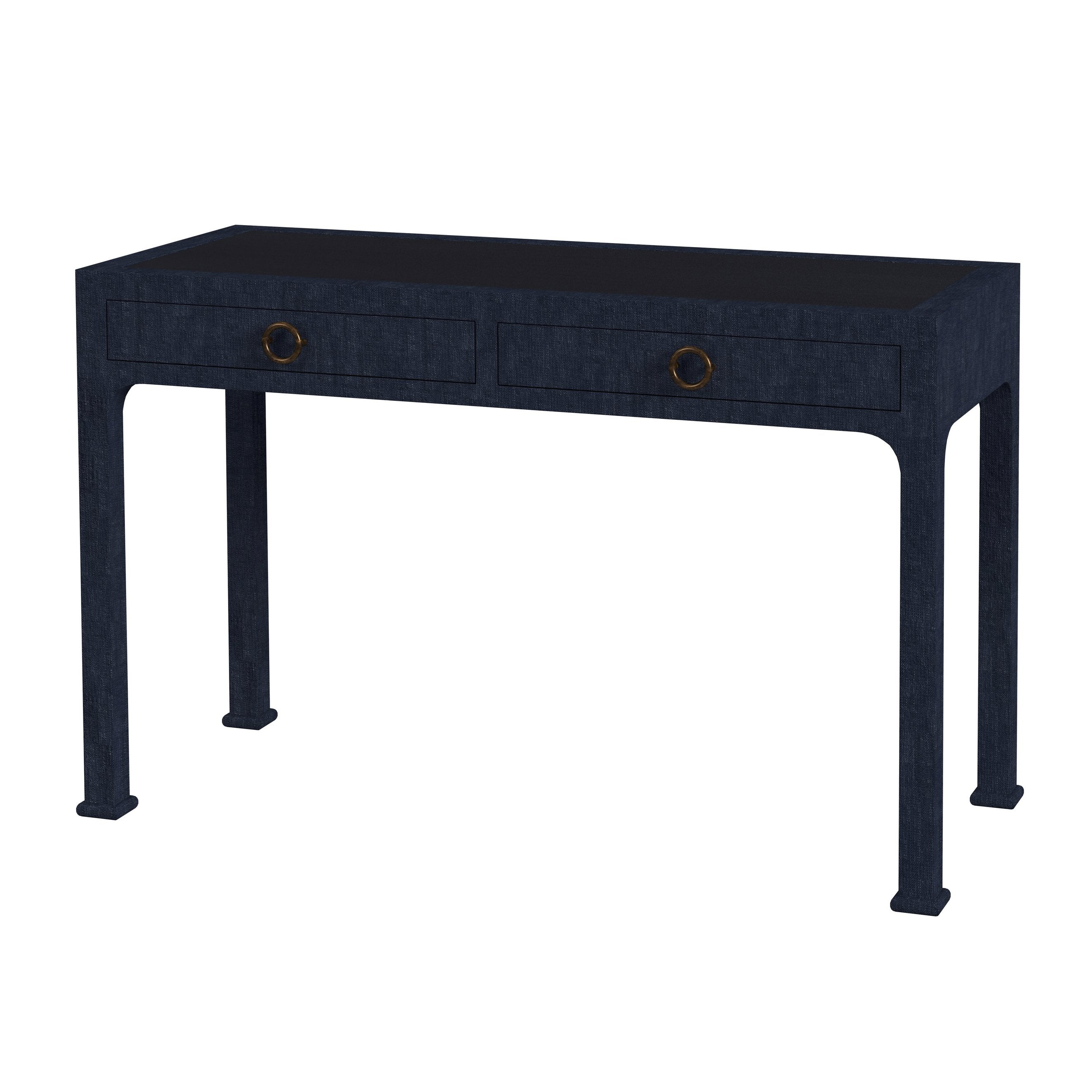 - The color is dark navy with brass finished hardware pulls
