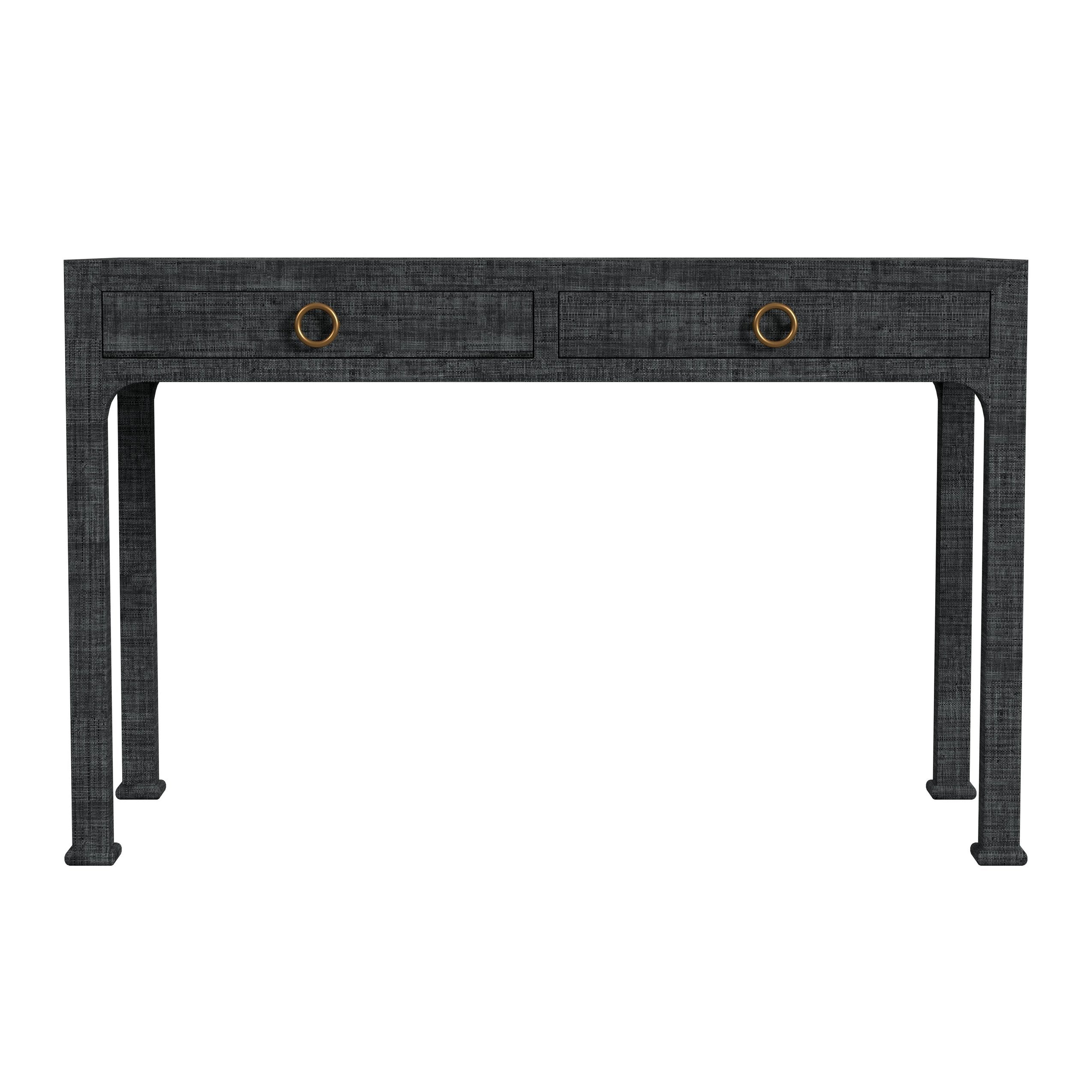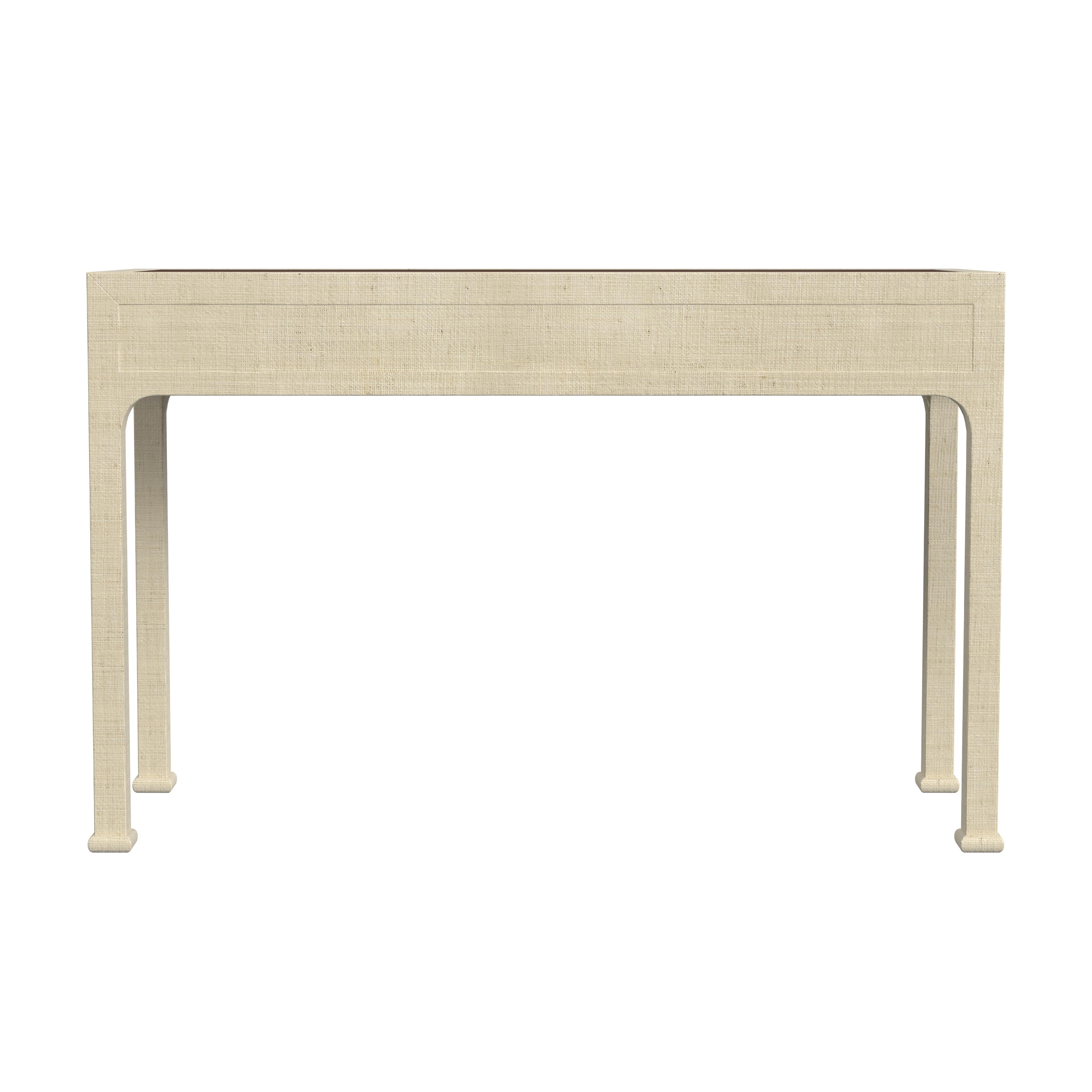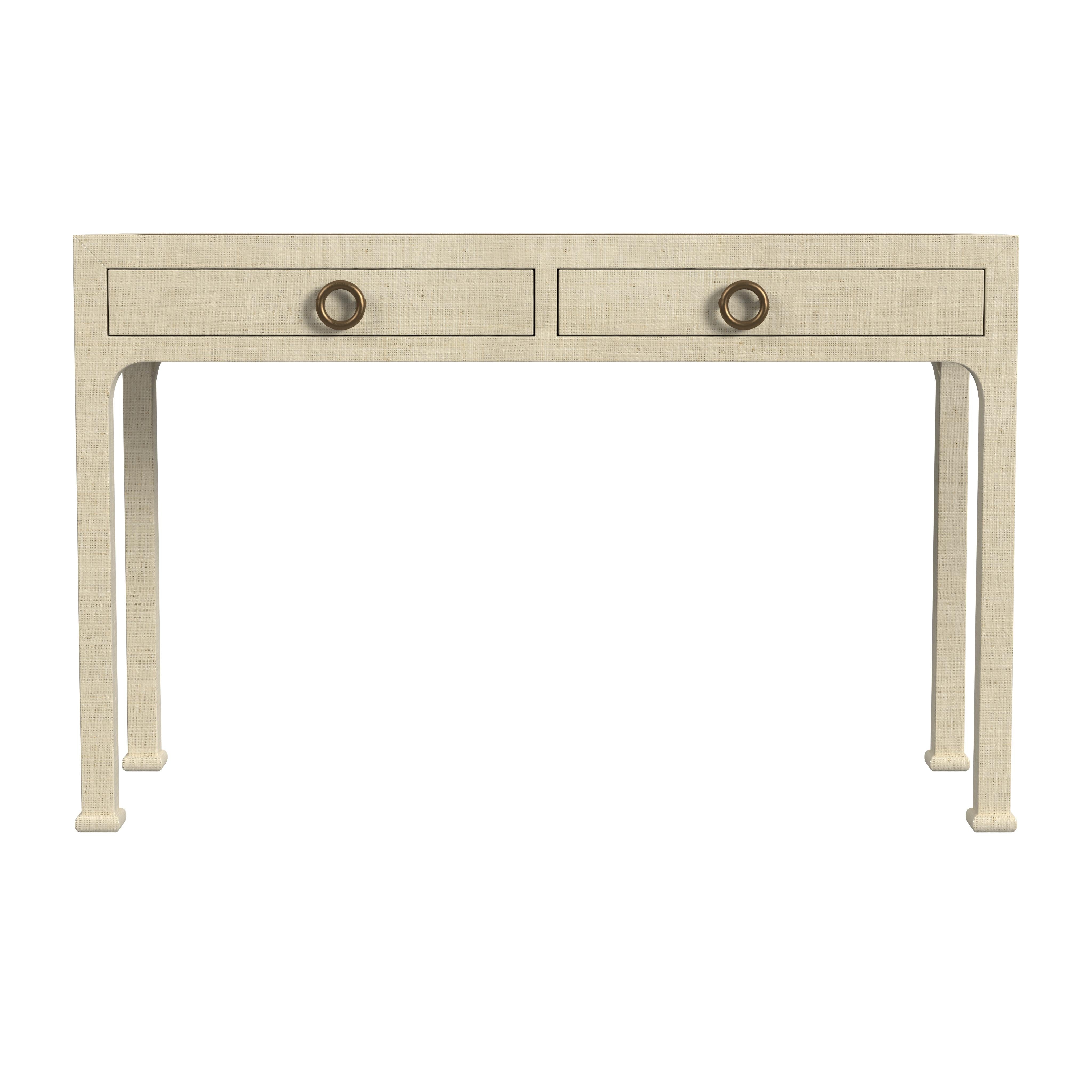 - Product Features (Construction Details): Construction Details: This desk features a solid Gmelina wood frame for sturdy durability, paired with an oak veneer top over engineered wood for added strength and style. It is hand-wrapped in woven raffia, a durable, straw-like material with distinctive markings and subtle tonal dye variations, ensuring each piece is unique. The clear lacquer finish enhances the raffia's natural texture while offering lasting protection. Dovetail joinery adds classic craftsmanship and stability, while smooth metal drawer glides provide effortless functionality for a polished and practical design.