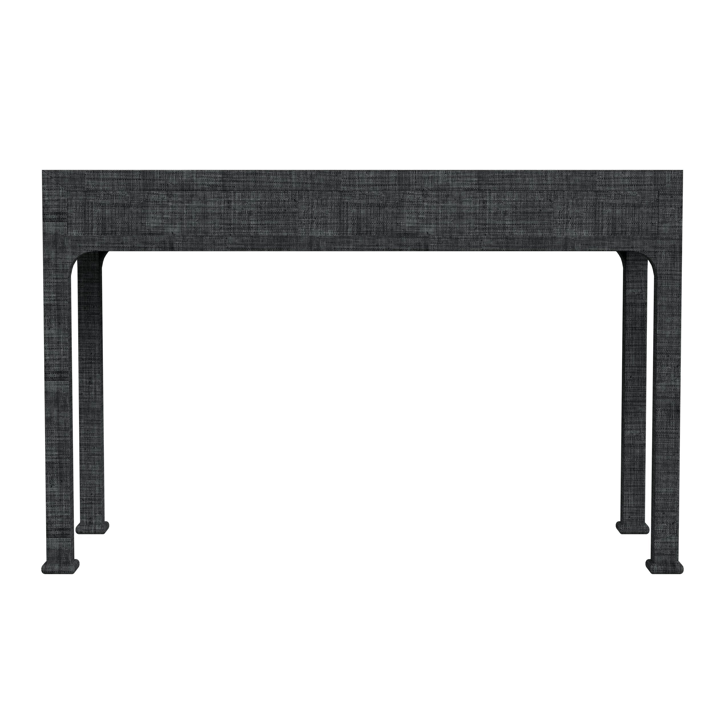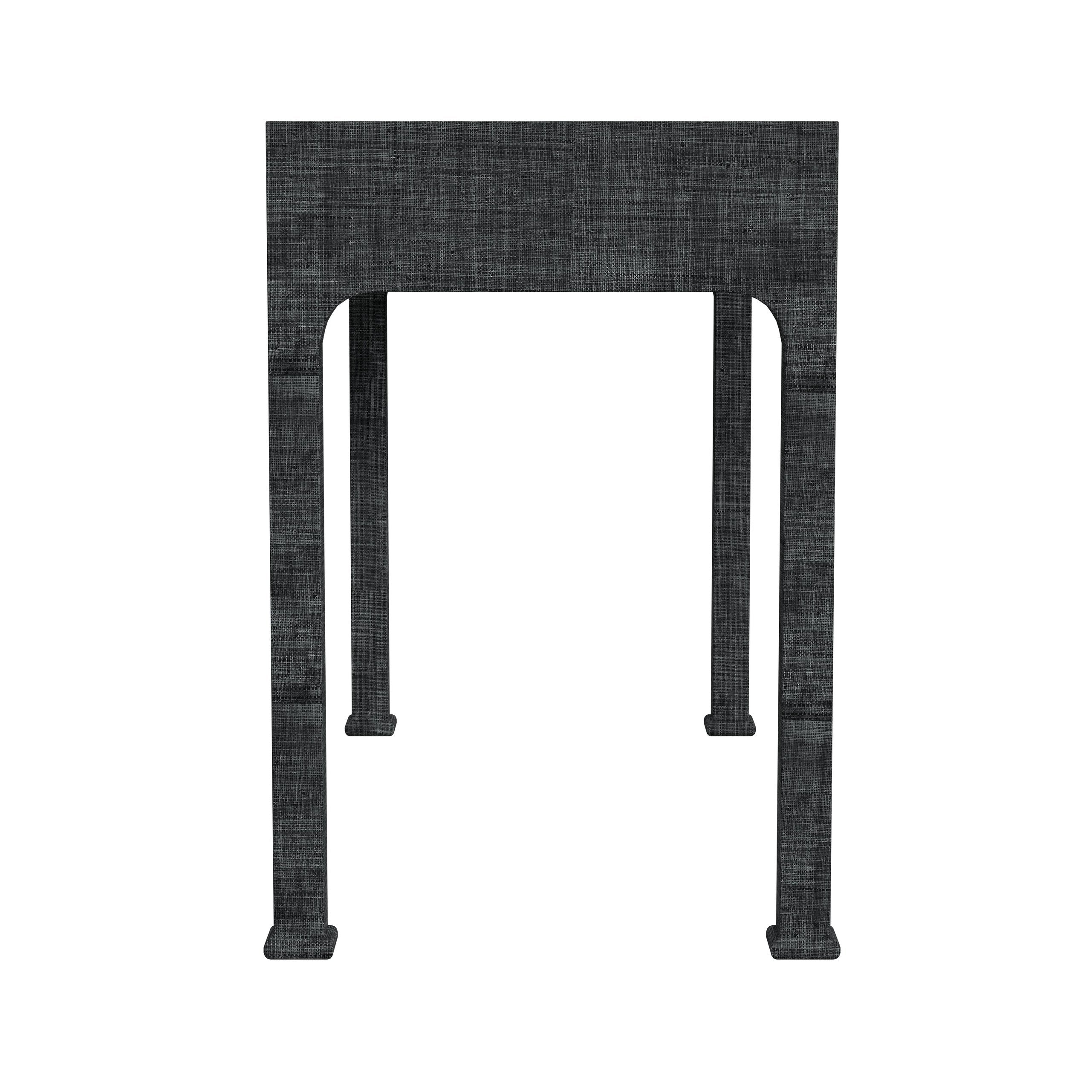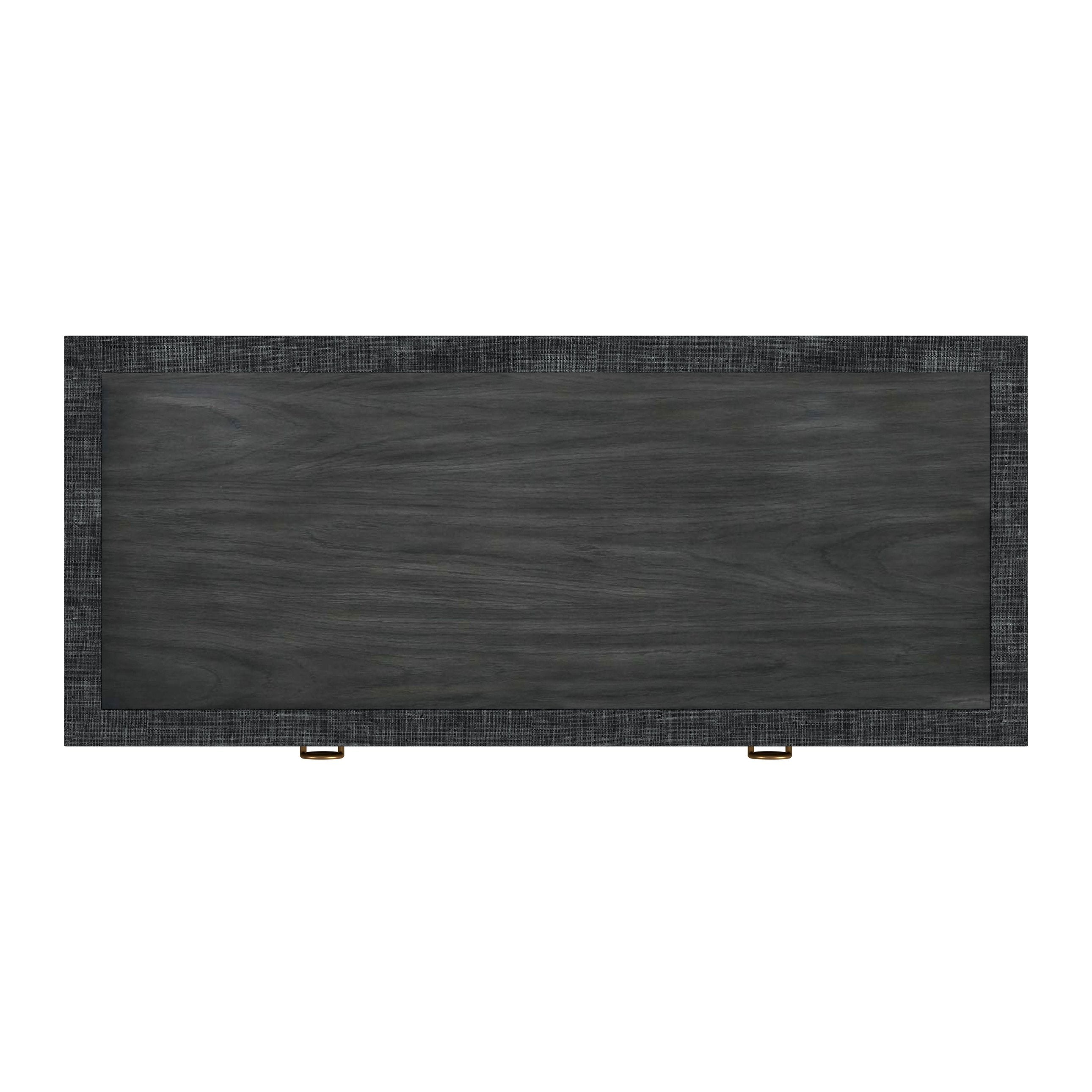 - Wood inset top in a charcoal gray washed finish and frame hand-wrapped in woven raffia, a durable straw-like material with distinctive markings and subtle tonal variations in the dyeing process that makes each piece truly unique.