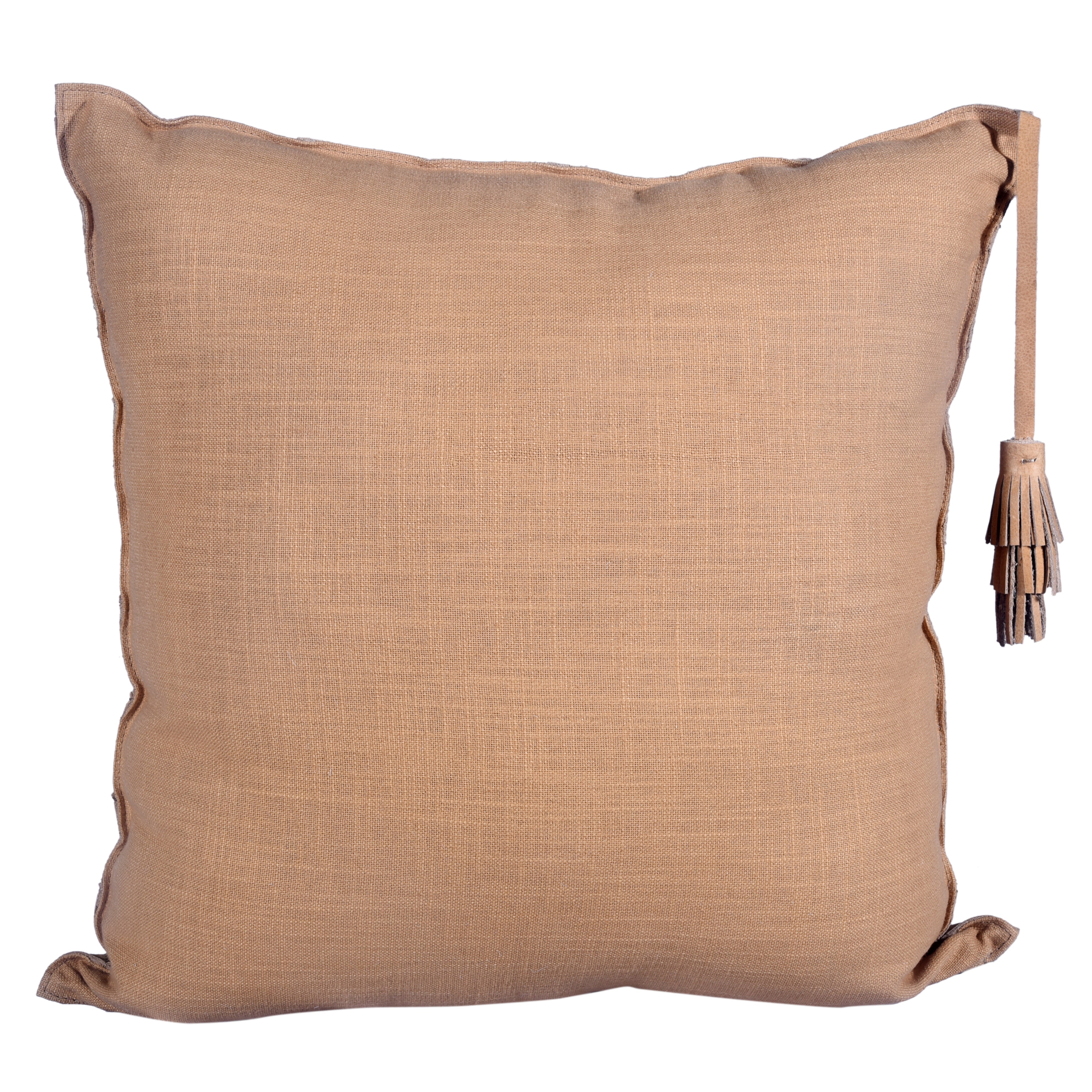 A rustic chic element for any ensemble, this accent pillow features genuine leather in soft tan, stitched into an oversized chevron pattern. Stitched knife edges complete the look for a refined finish, while a single leather tasseled corner adds a decorative Western touch. Coordinate with other genuine leather pillows to complete the look. Designed to complement our range of Western, Southwestern, and modern rustic collections.