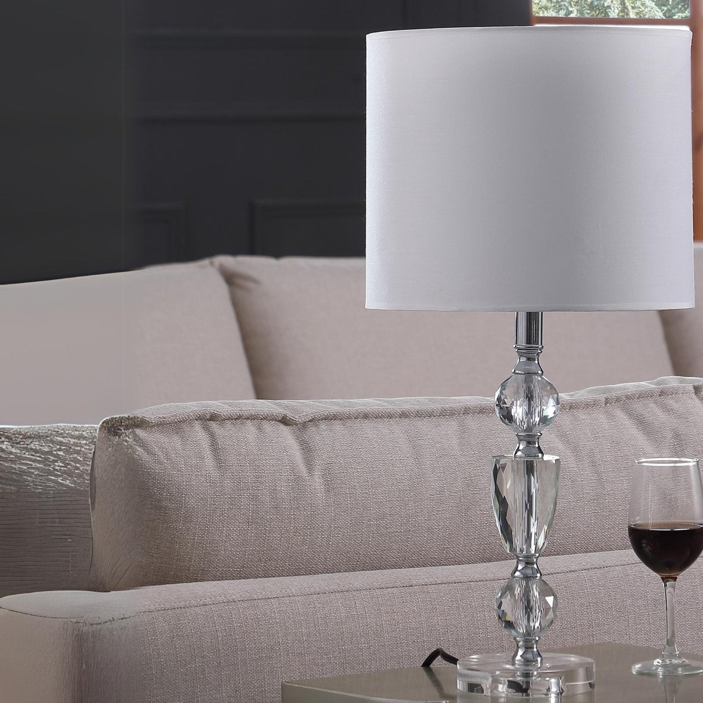 Elevate your living space with this refined modern table lamp that combines cut-crystal brilliance with sleek chrome accents and a soft white drum shade. Perfect for bedside tables, desks, or accent lighting, this lamp delivers a polished, contemporary look while providing dependable, dimmable illumination suitable for everyday use.