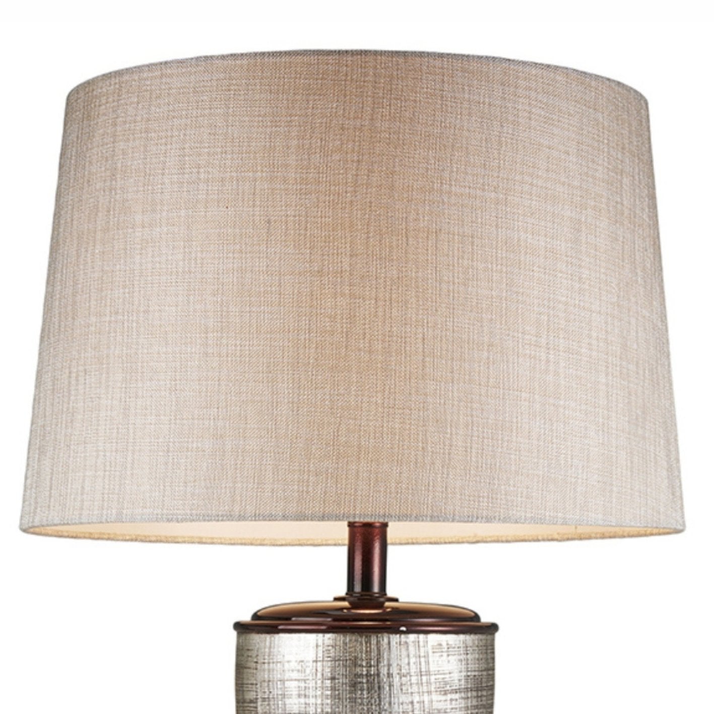 - Shade: Silvery linen/cotton blend drum shade; shade measures 17" L x 17" W x 11" H