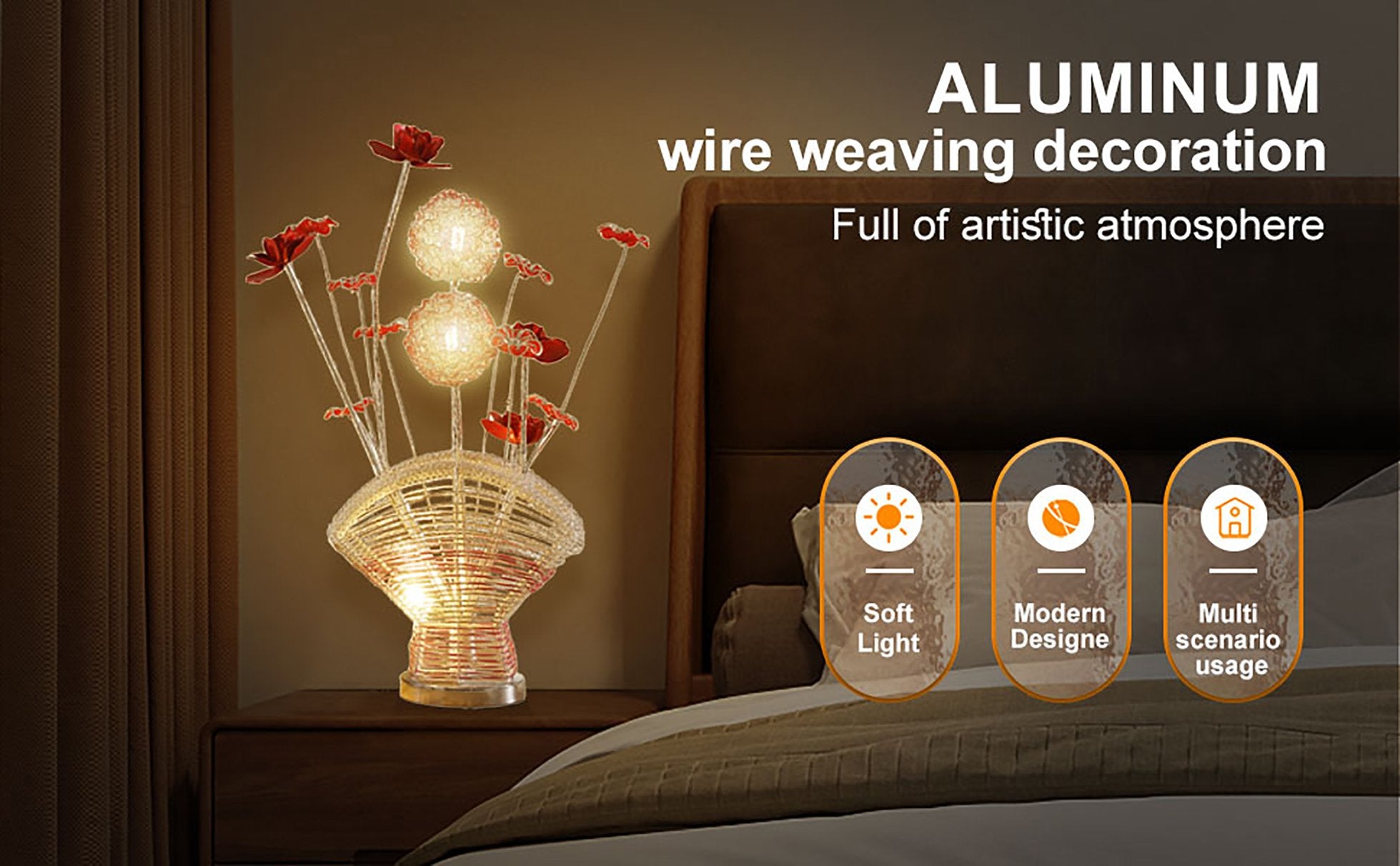 - Lighting: Includes three 3W G4 bi-pin LED bulbs—two inside the red/silver wire flower bud and one illuminating the aluminum vase interior—for balanced accent lighting and low energy use.