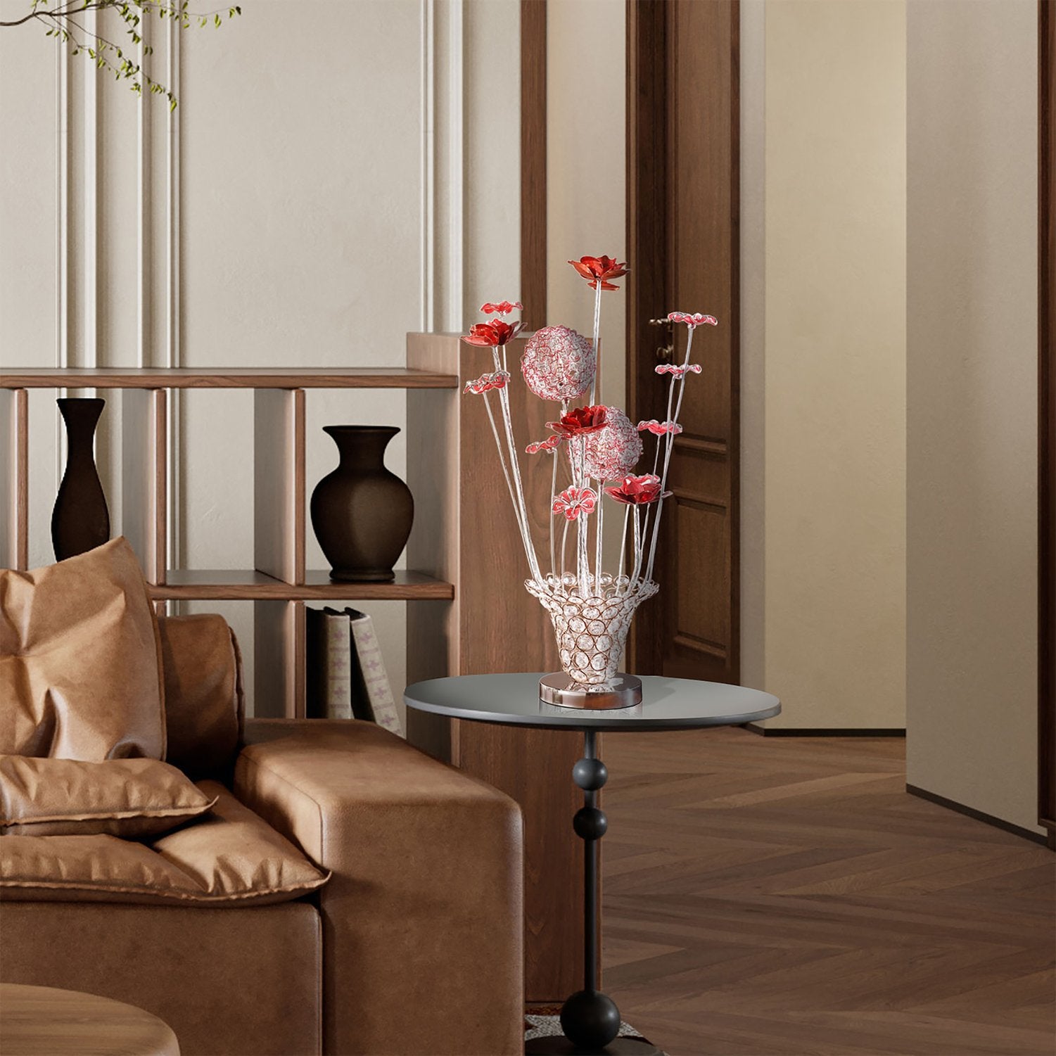 - Lighting: Includes three 3-watt G4 bi-pin LED bulbs — two housed within the red/silver wire flower buds and one integrated around the aluminum interior of the vase for layered, ambient illumination.