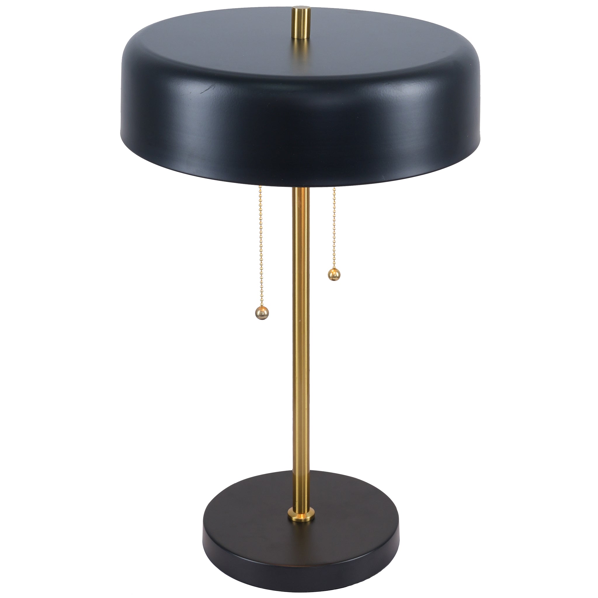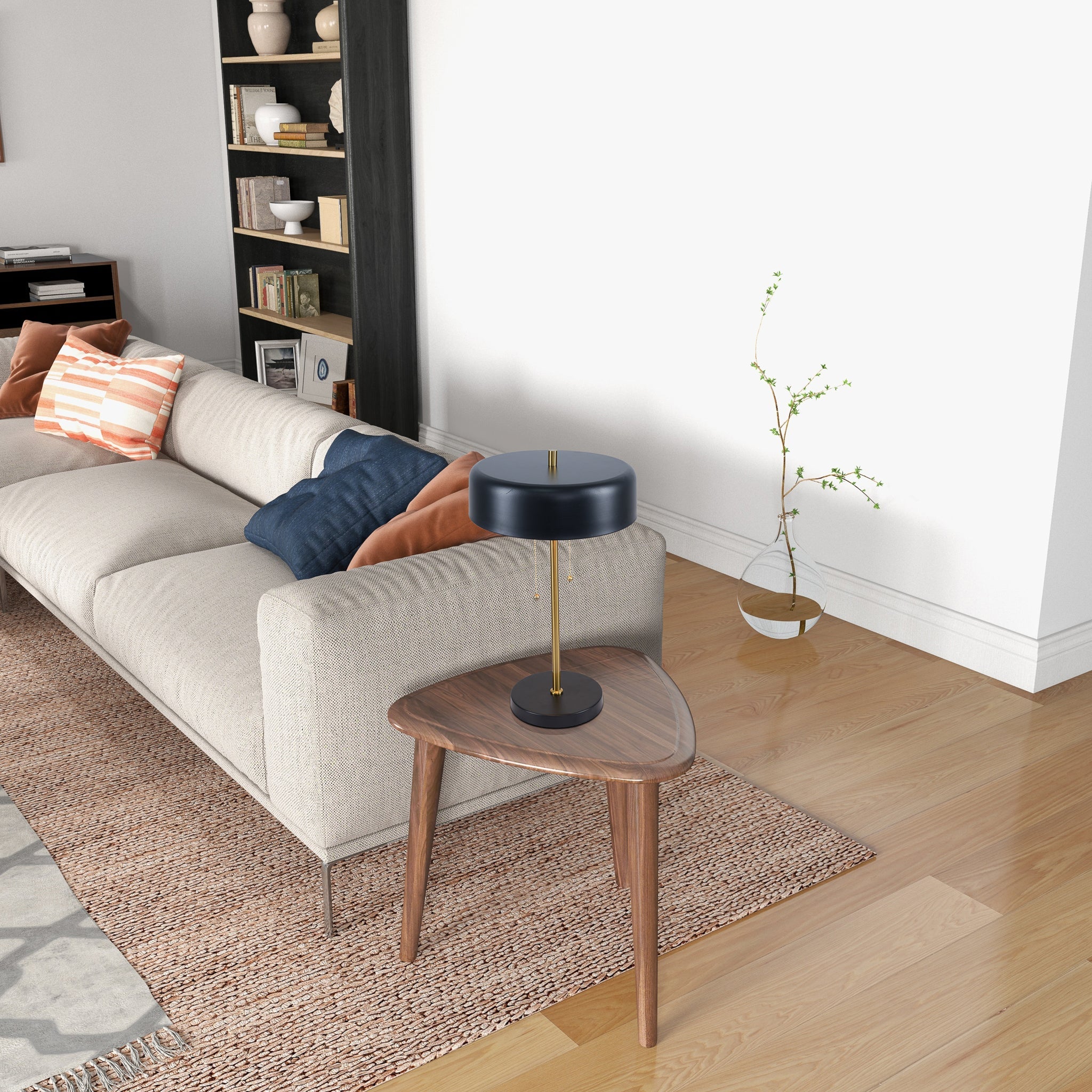 Bring modern nordic styling and warm, diffused light to your bedroom, study, or bedside table with this Obni table lamp. Its clean black metal base and contrasting black exterior/white interior drum shade deliver a refined, contemporary look while the pull chain switch and evenly diffused shade provide simple, functional lighting for reading, relaxing, or working.