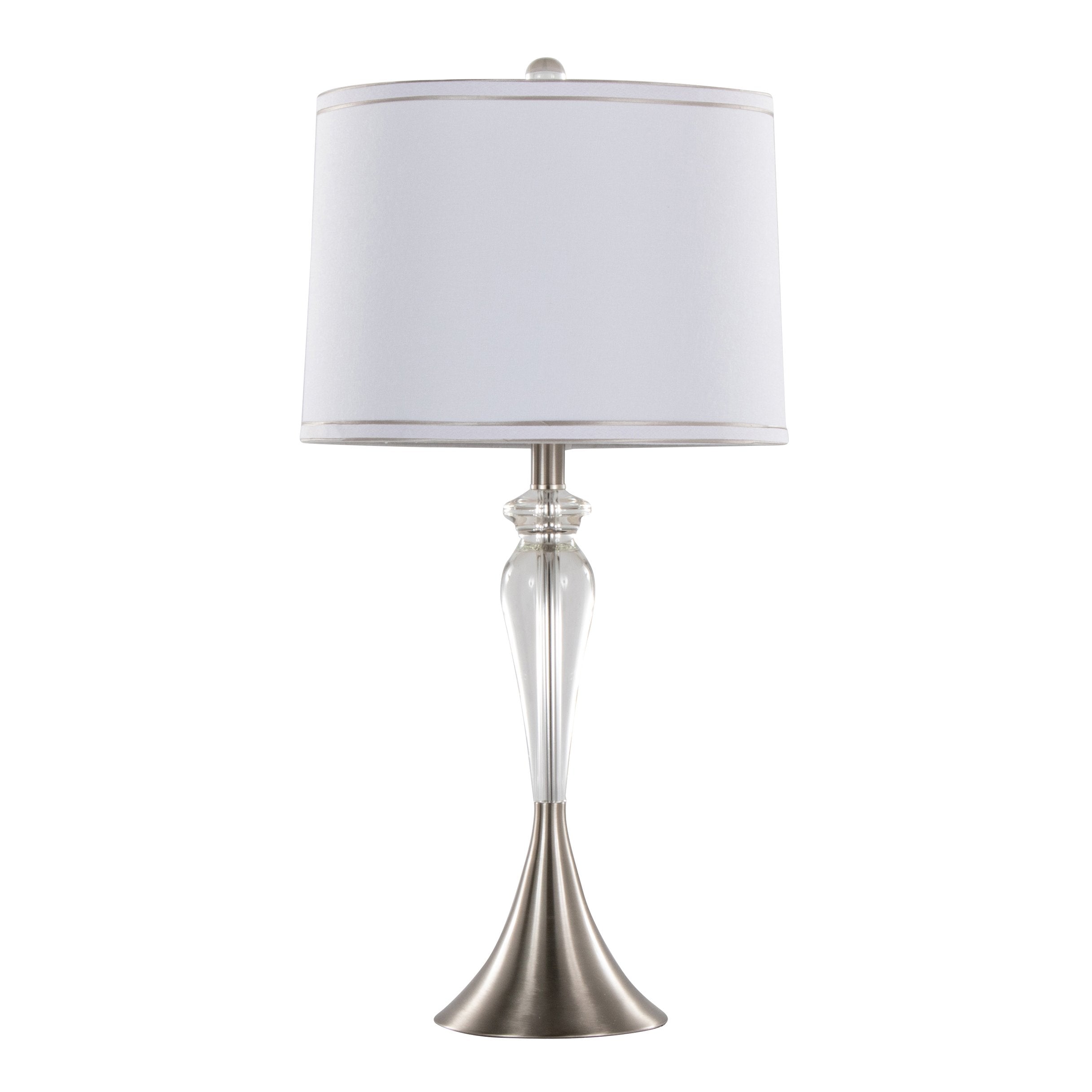 Add a touch of modern elegance to any room with this pair of Ashland table lamps. Each lamp blends clear crystal and brushed nickel for a sophisticated hourglass silhouette, topped with a crisp white linen empire shade with silver trim to diffuse warm, inviting light. Ideal for living rooms, bedrooms, or office side tables, this set of two lamps combines refined materials and practical features for everyday use.