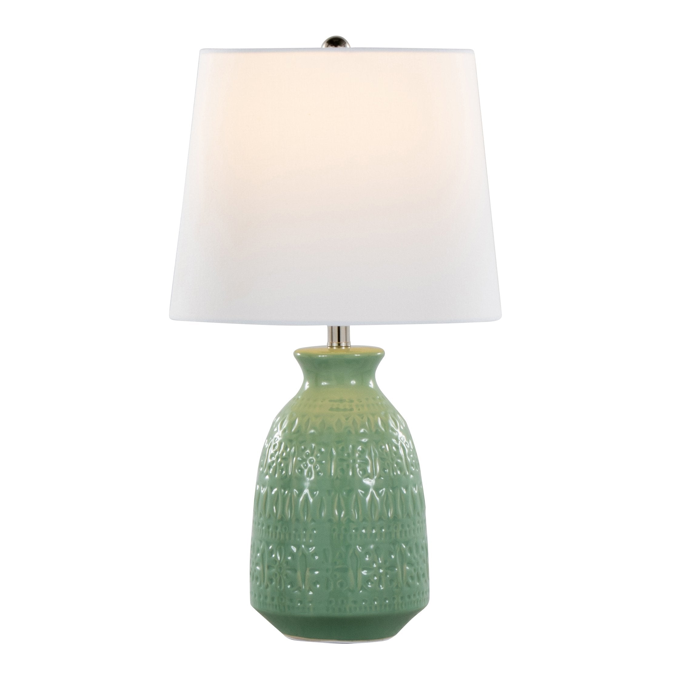 Add a warm, sculptural touch to any room with this pair of contemporary ceramic accent lamps. Their vase-shaped, textured bases in sage green ceramic pair with polished nickel accents and crisp white linen empire shades to create a versatile look that complements modern and transitional interiors. Perfect for nightstands, side tables, entry consoles, or office surfaces, these lamps deliver soft, flattering illumination while acting as stylish decor statements.