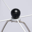 - Featuring an artistic silhouette with two discs in the center or of a unique body, a classic white fabric shade, a marble pedestal base in the shape of a cone, and a sleek black aluminum construction, this table lamp offers both contemporary charm and intrigue in equal measure.