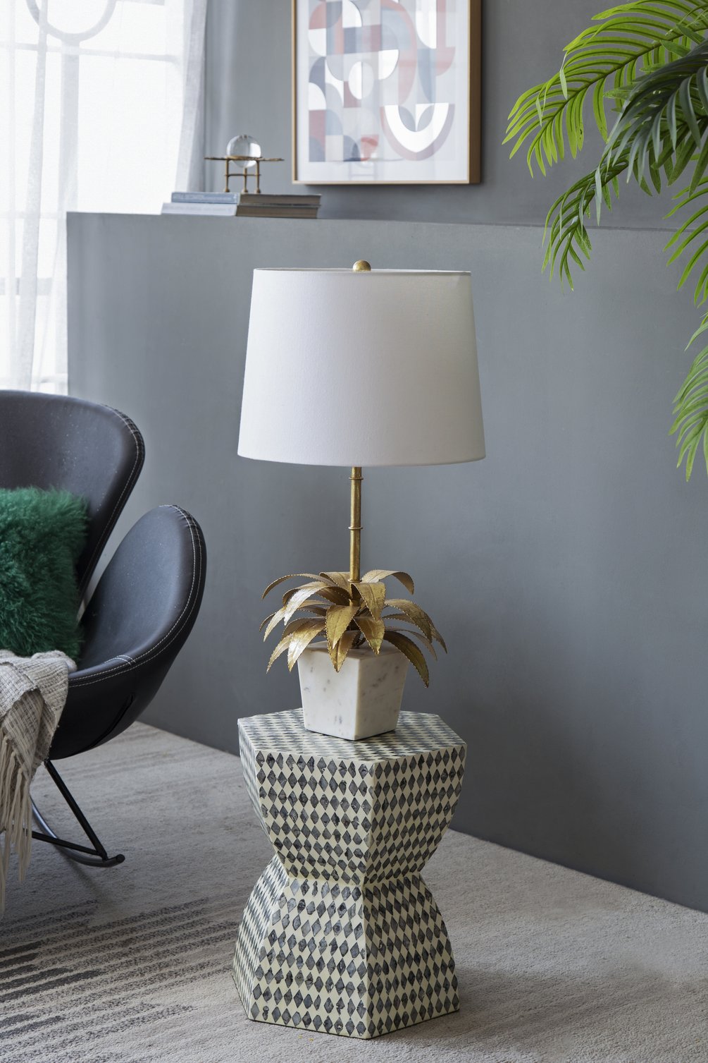 - Base & stem: Reeded bamboo-inspired stem with delicate gold leaf accents for sculptural interest