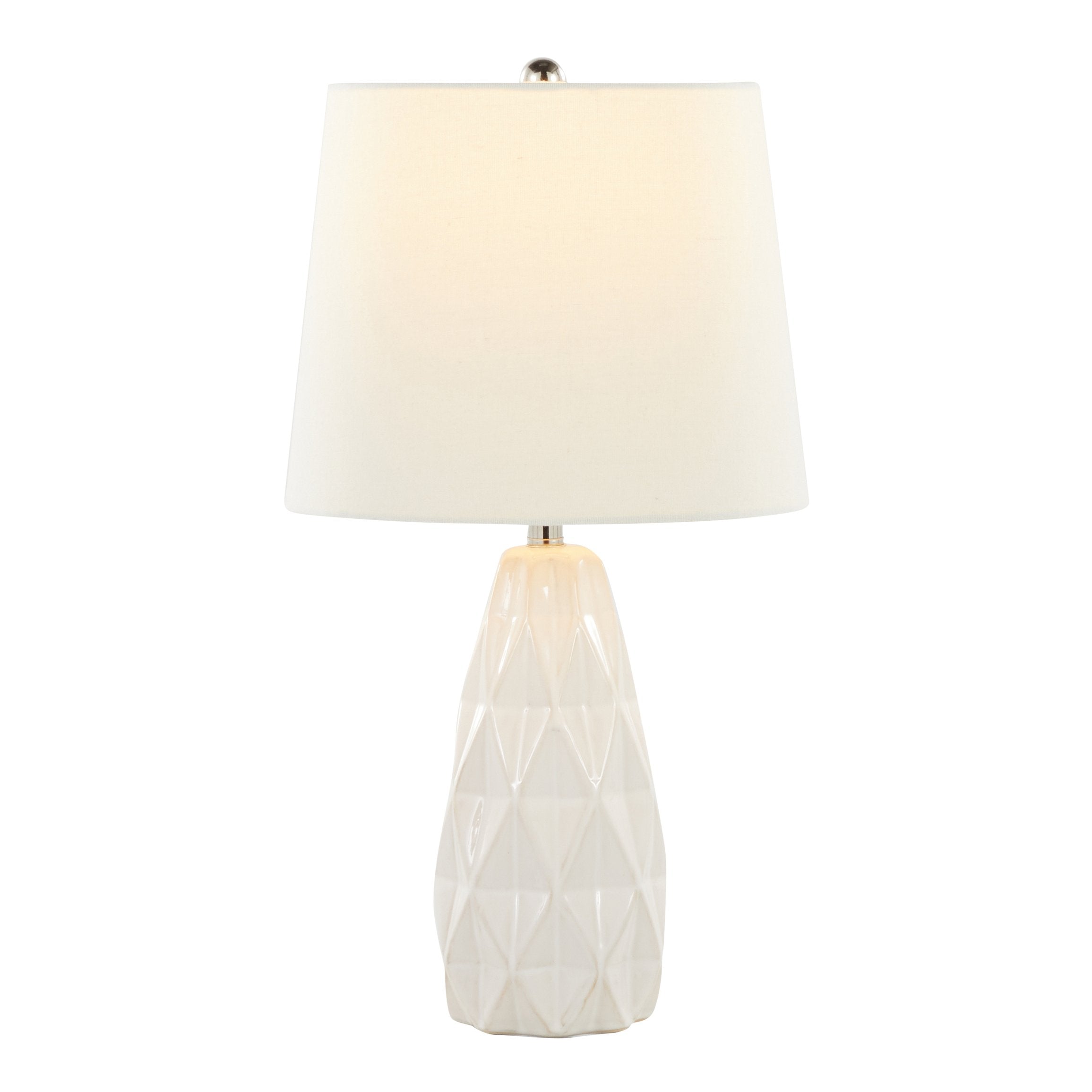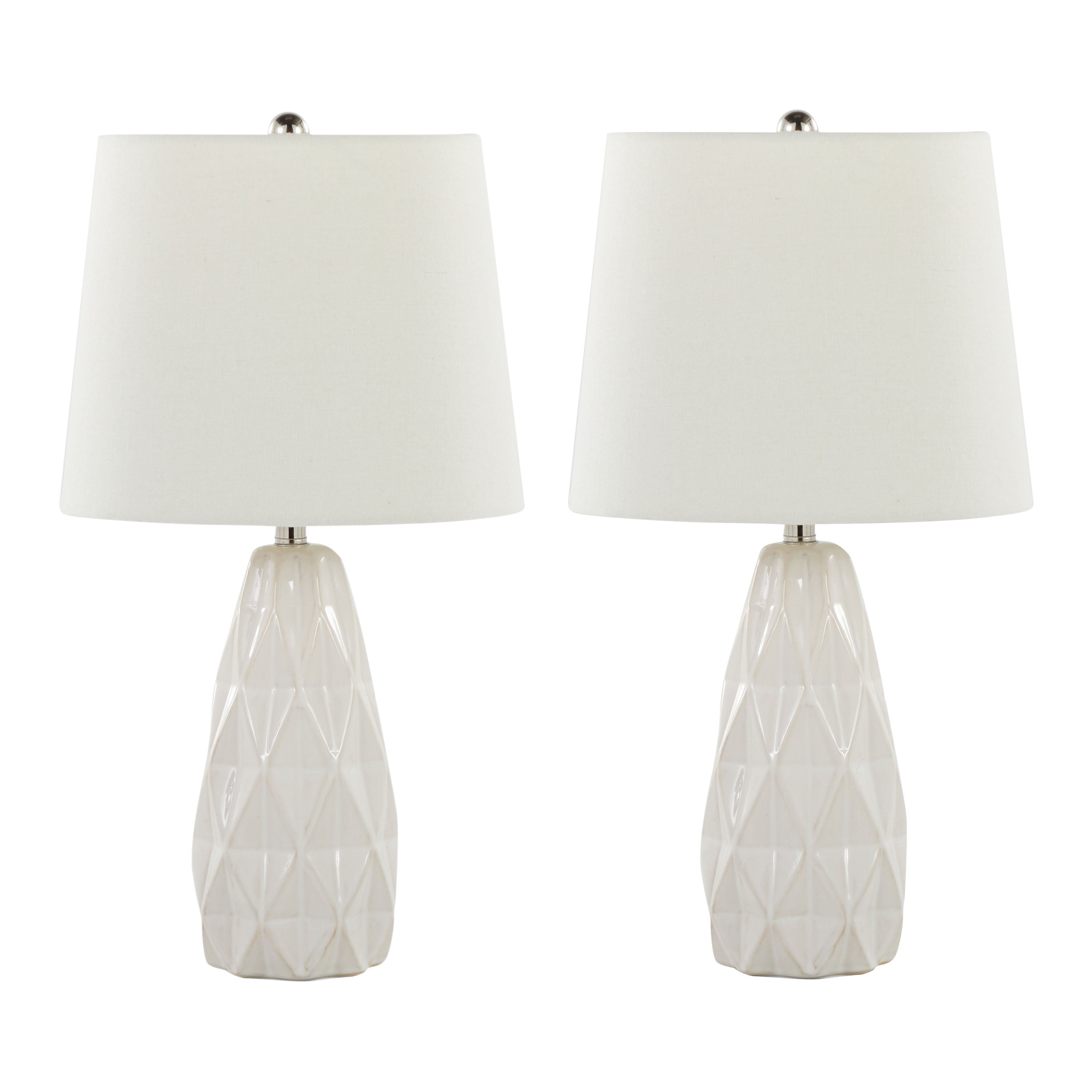Brighten your room with modern sculptural style. This set of two Hex ceramic accent lamps blends textured off-white ceramic with polished nickel accents and an off-white linen shade, delivering soft ambient light and contemporary visual interest for bedrooms, living rooms, or entryways.