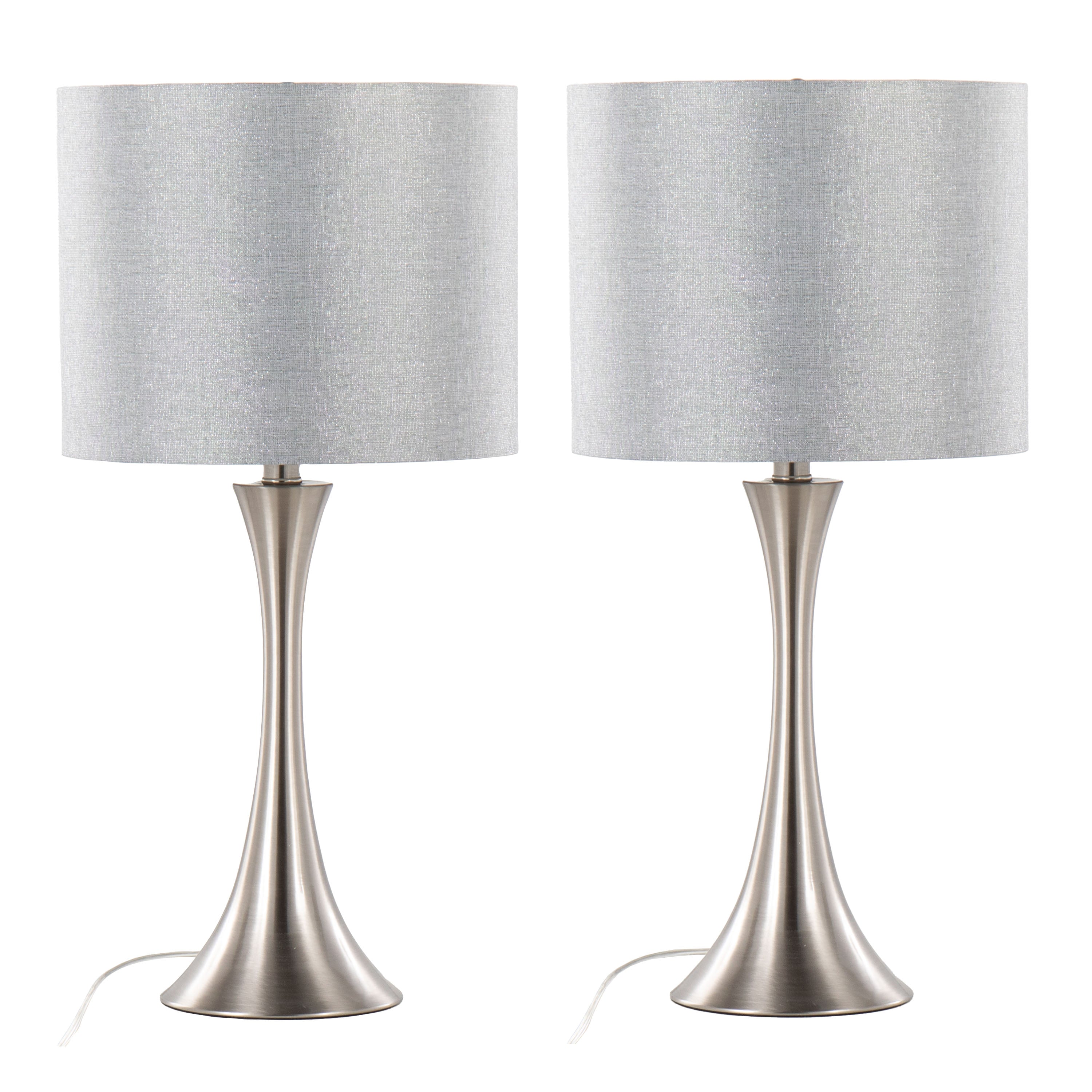 Bring contemporary elegance and subtle sparkle to your room with this coordinated set of two table lamps. Each lamp combines a sleek brushed nickel metal base with a grey linen drum shade woven with silver metallic threading, delivering versatile style for bedrooms, living rooms, or office spaces. The graceful hourglass silhouette and round base create a modern focal point while the neutral tones make the lamps easy to pair with existing décor.