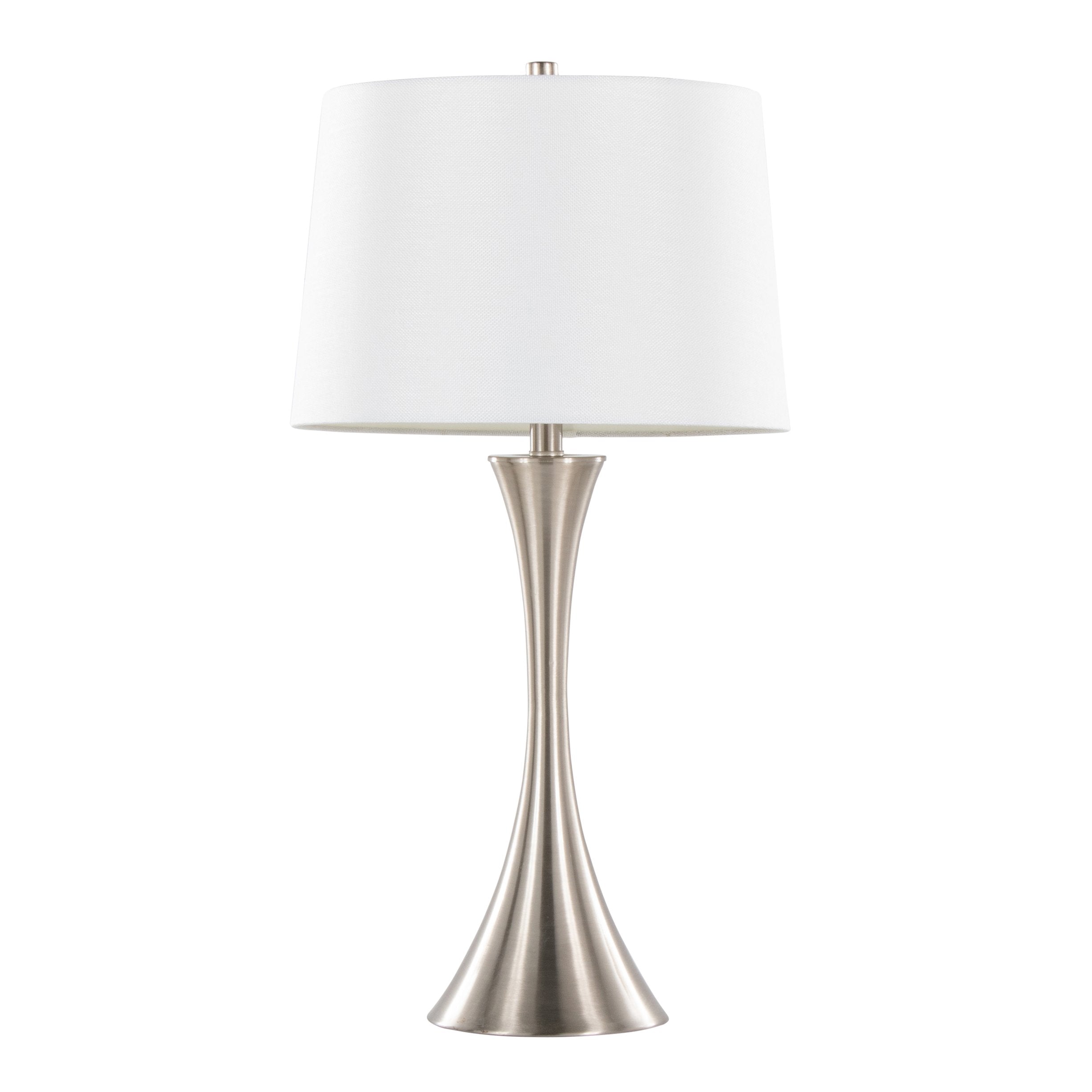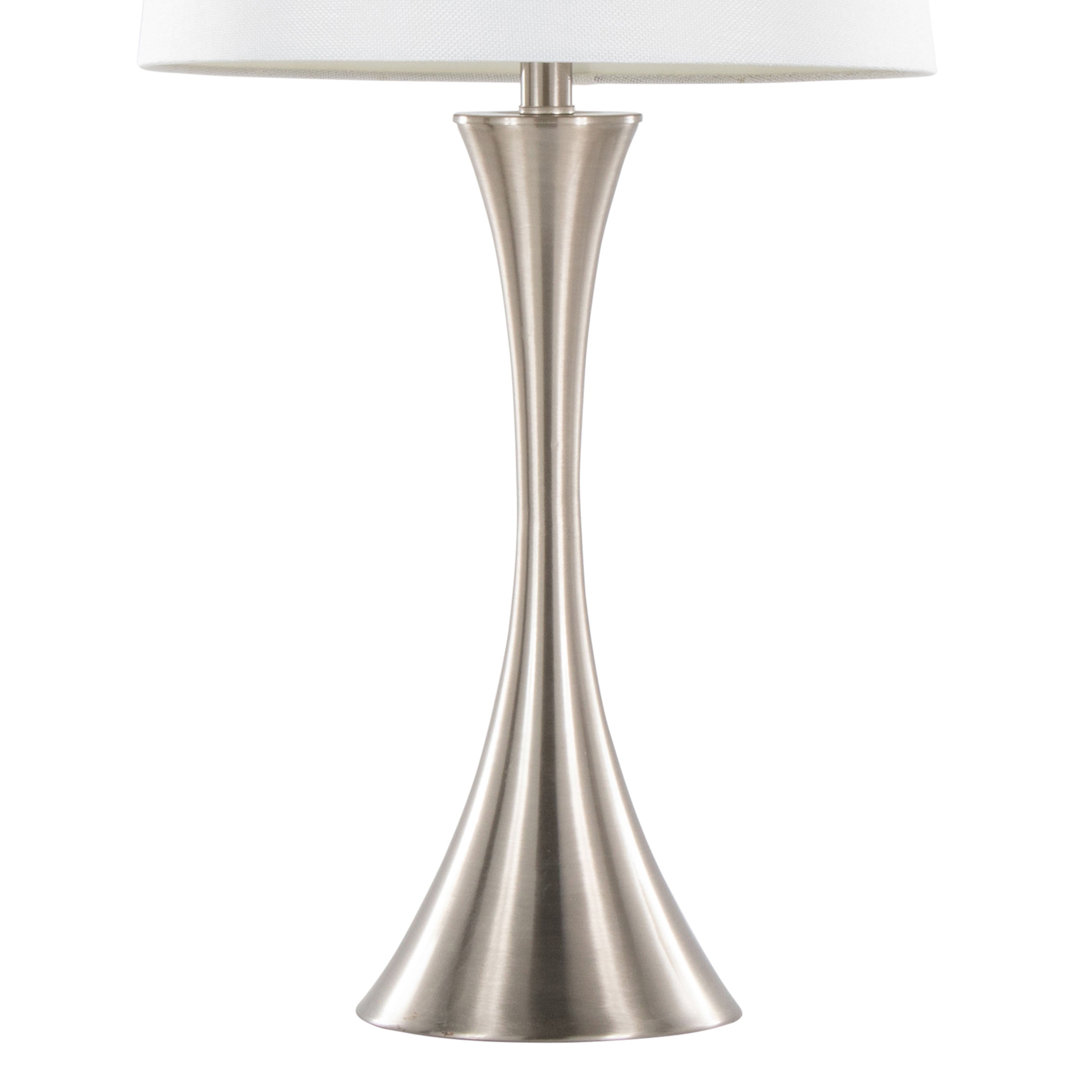 Brighten your room with the Lenuxe table lamp set — a pair of contemporary metal lamps that combine clean lines and soft textures for a versatile, modern look. The brushed nickel finish and white textured linen drum shades provide warm, diffused light that complements bedrooms, living rooms, and reading corners, while the hourglass silhouette and round base add elegant visual interest.