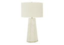 Brighten your space with this elegant transitional table lamp featuring a curvaceous blue ceramic base and a simple ivory/cream linen shade. Its balanced silhouette and subtle gold finial make it suitable for living rooms, bedrooms, home offices, or entryways—offering both decorative appeal and practical, adjustable illumination.