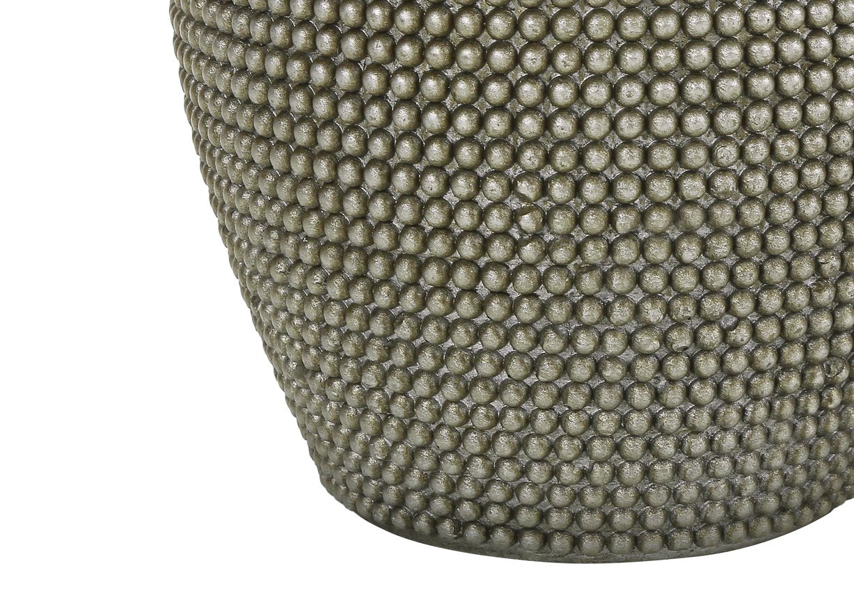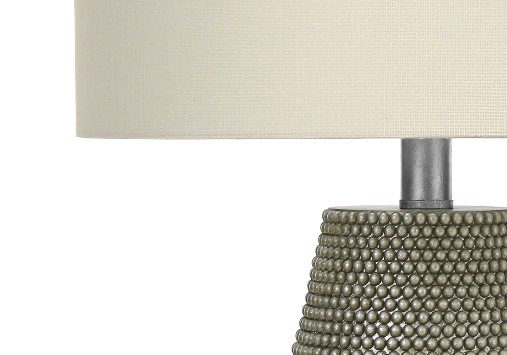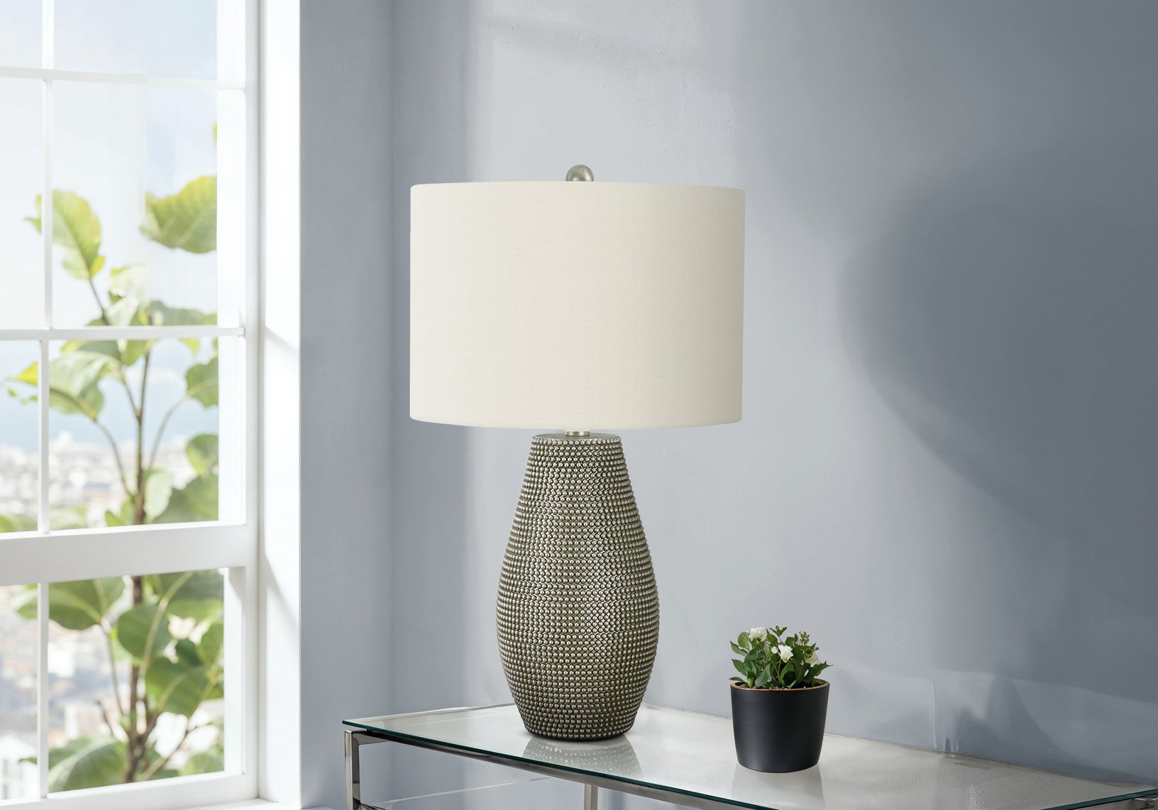 - Bring a touch of glam to your living room, entryway, office, or bedroom with this compact, globe shaped 19"h table lamp made with a grey resin textured base and topped with a chic, ivory fabric drum shade for a modern appeal.