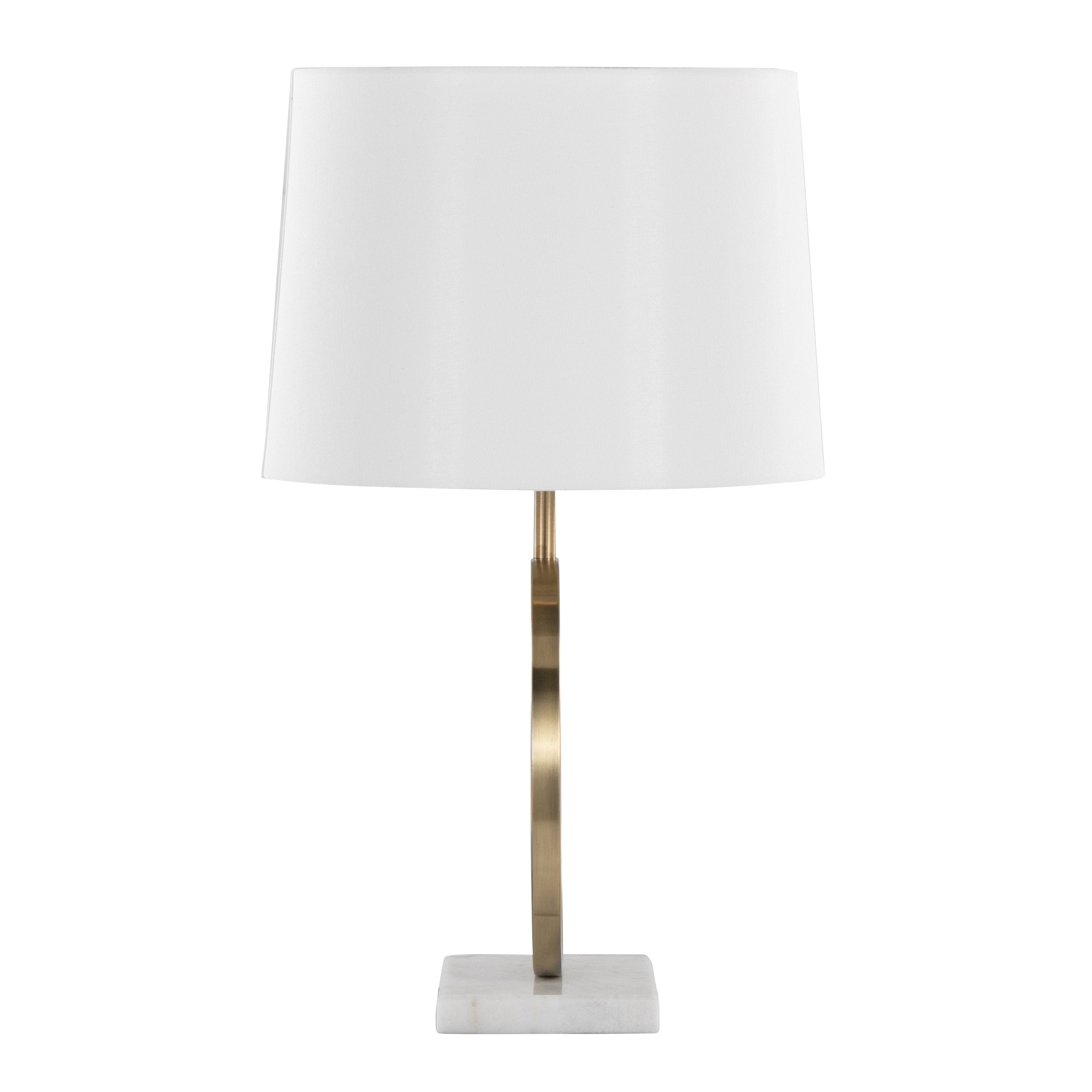 - Materials: Solid white marble base, circular gold-finish metal frame, white linen empire shade