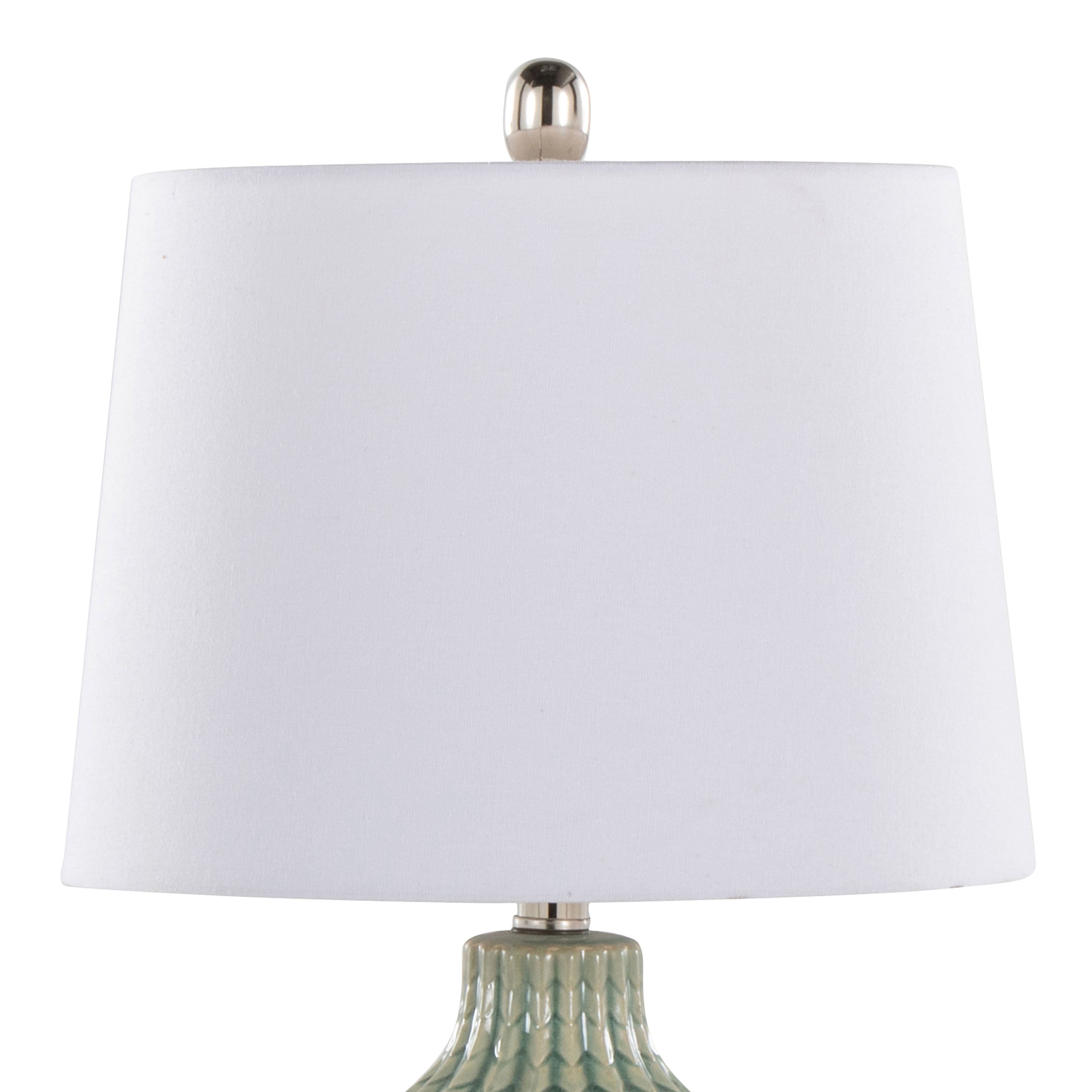 - Finish & Material: Sage crackle ceramic base with polished nickel hardware and a white linen tapered drum shade.