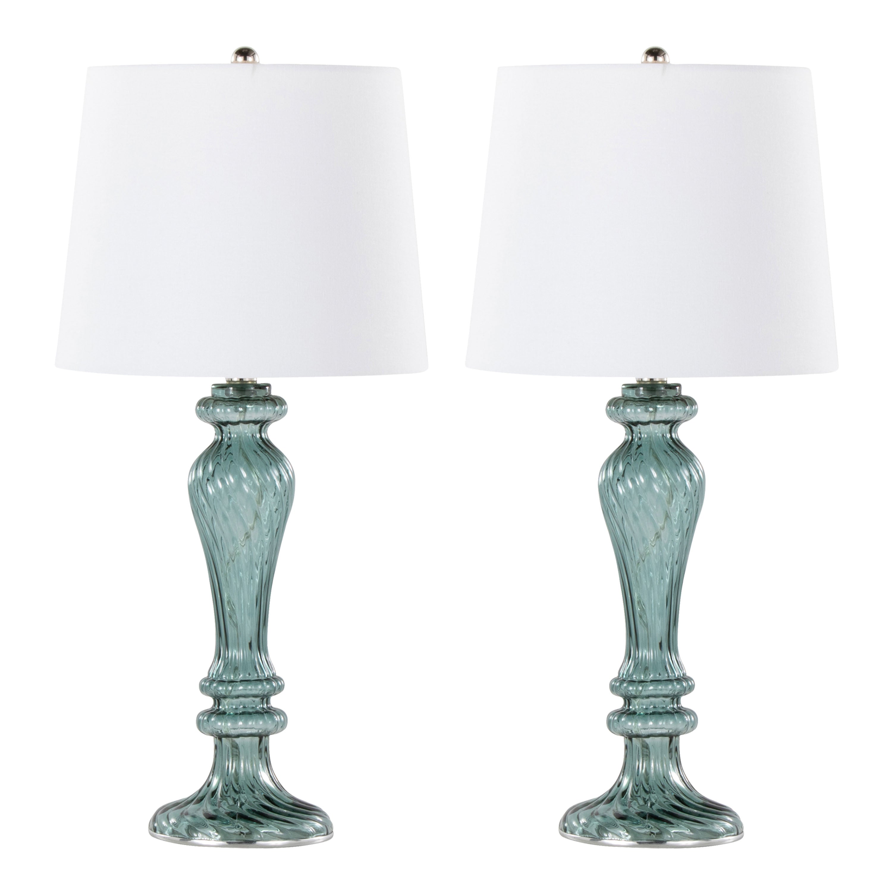 Elevate your décor with a pair of contemporary glass table lamps that blend sculptural form and soft, ambient lighting. These Windsor lamps feature a fluted clear turquoise glass column and a clean off-white linen drum shade, offering a refined focal point for living rooms, bedrooms, or entryways. Designed for everyday use, they pair polished nickel accents with simple functionality for a polished, modern look.