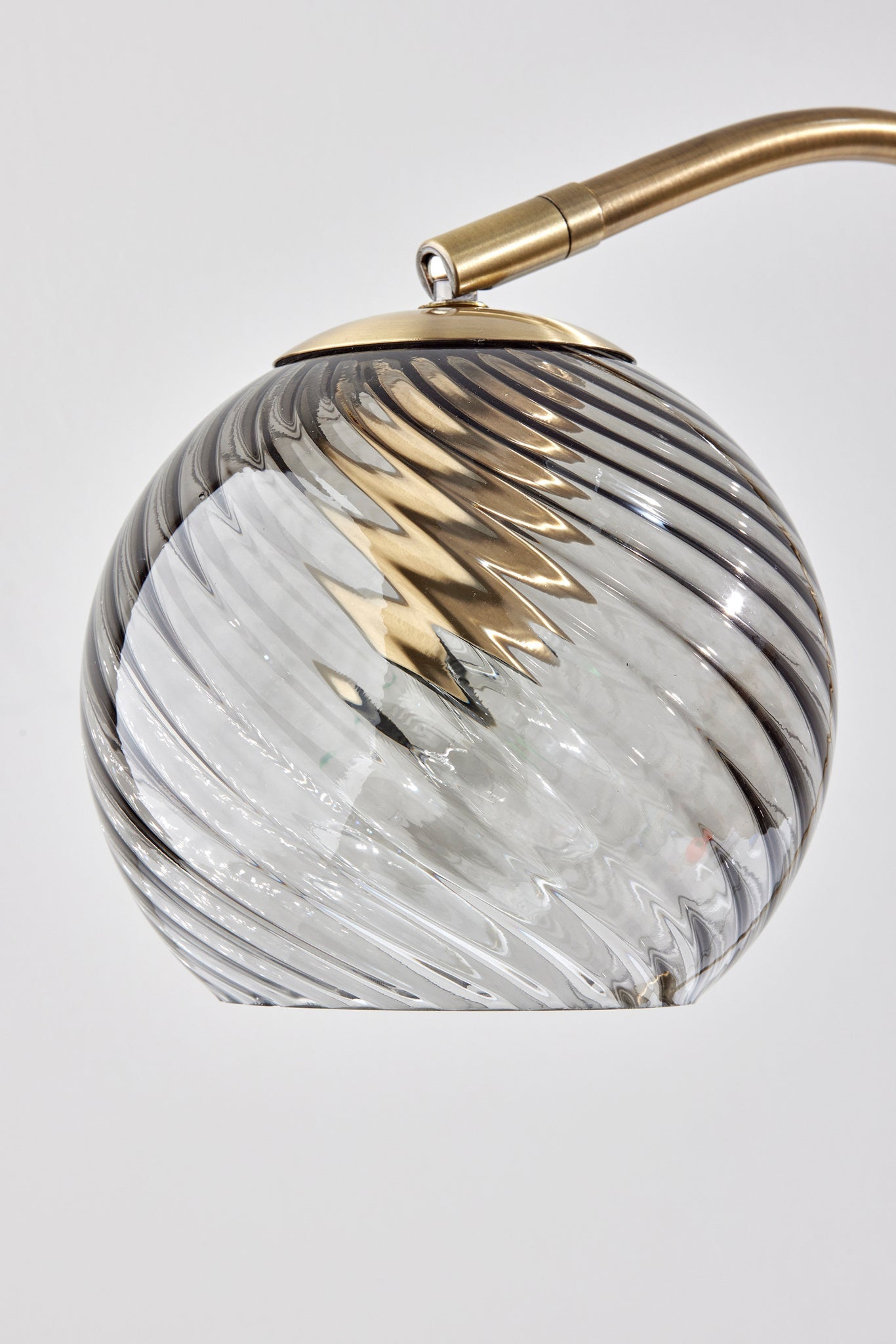 - Mid-Century style table lamp with antiqued brass base and light gray globe swirl shade.