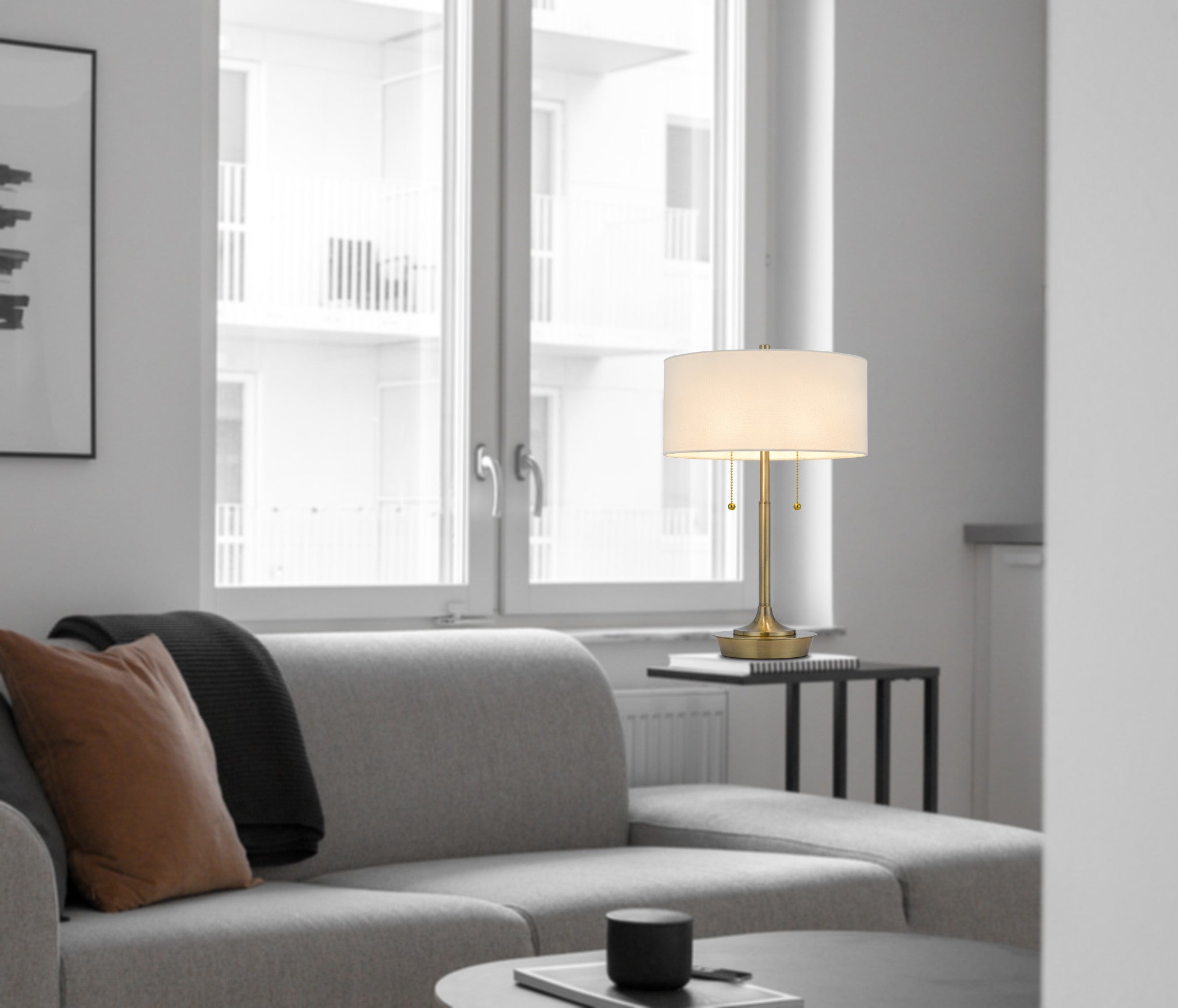 - Contemporary table lamp with antiqued brass base.