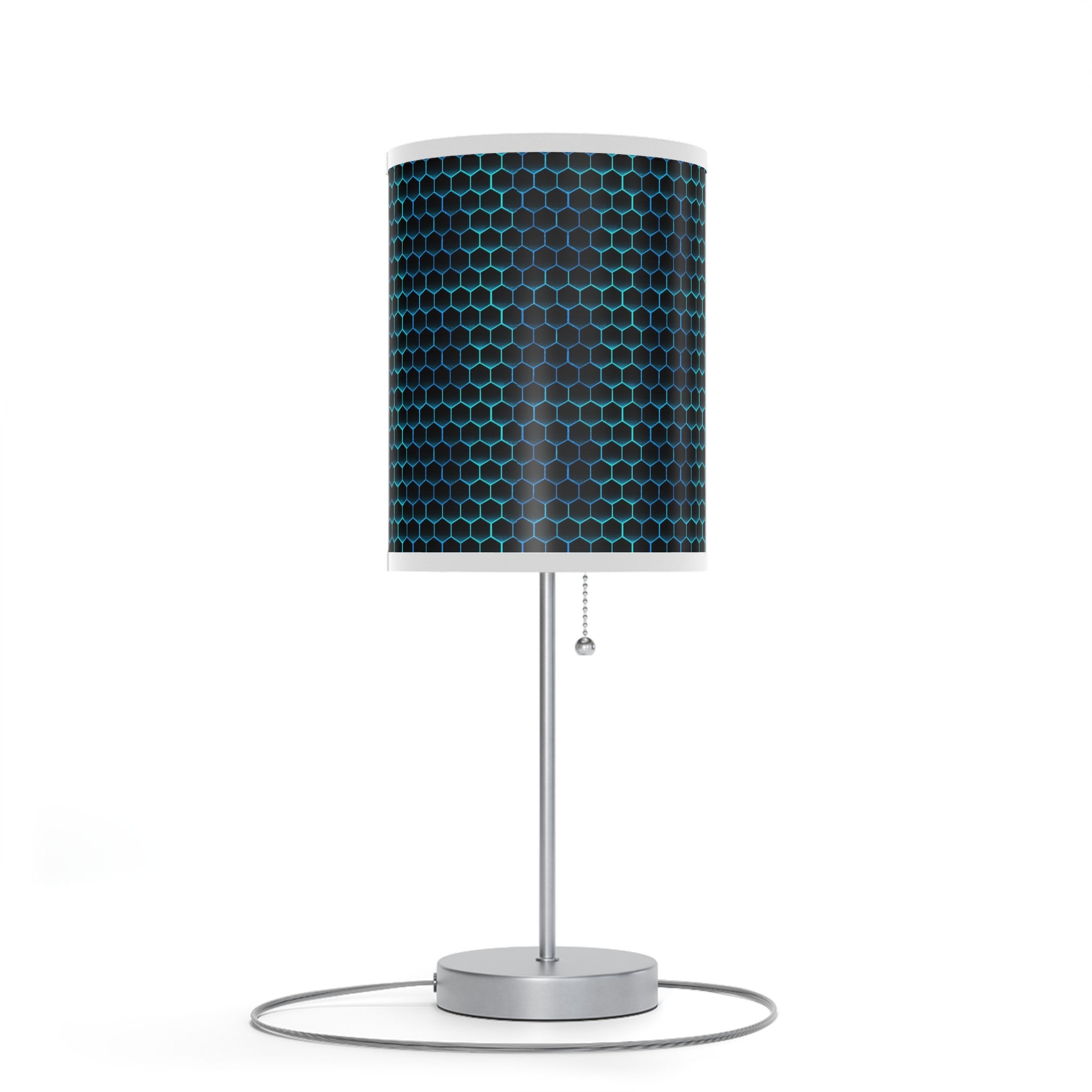 - Fashionable table, bedside, or desk lamp with an edgy neon honeycomb design on black printed shade.