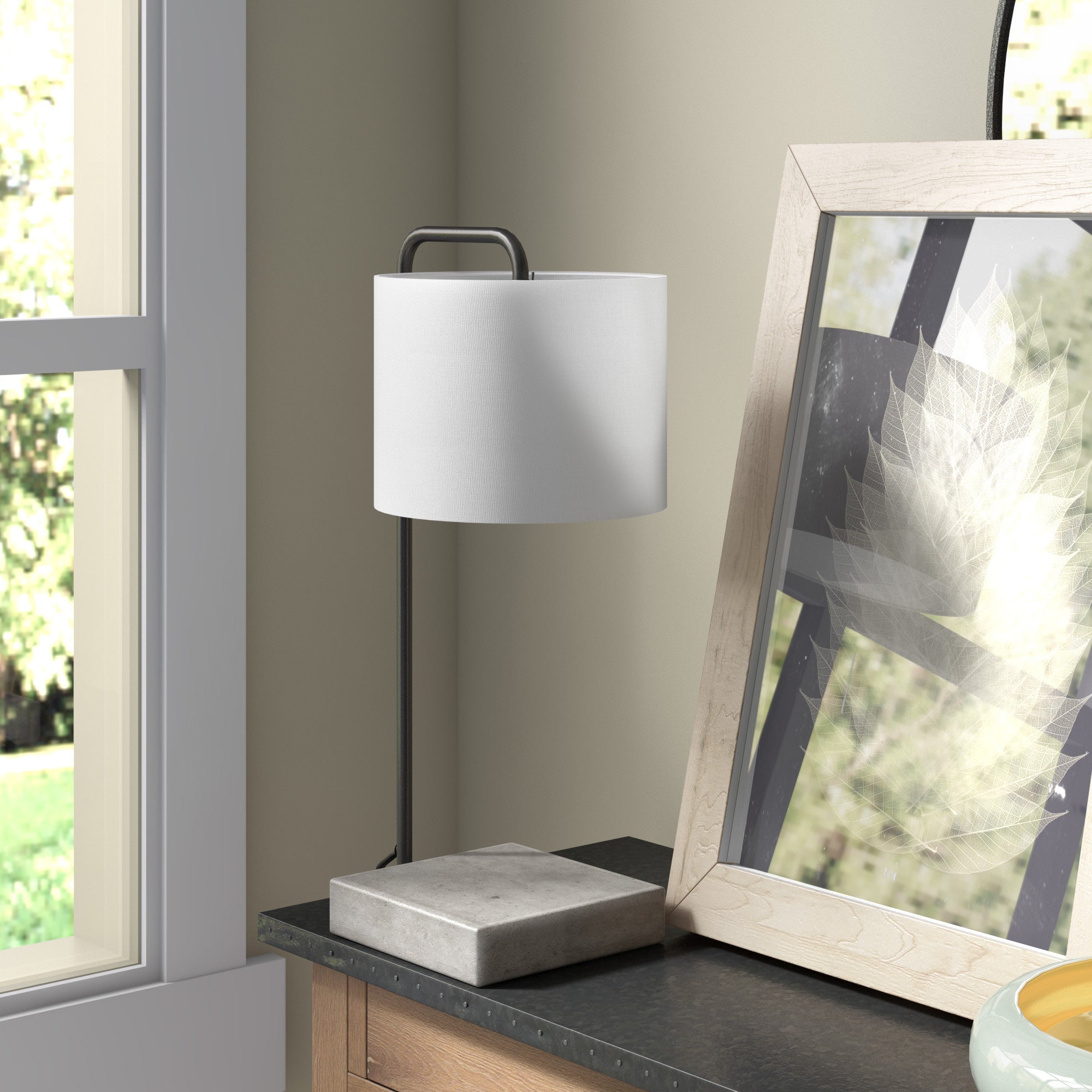 - Industrial-style table lamp with a black and gray base and a white fabric shade included.