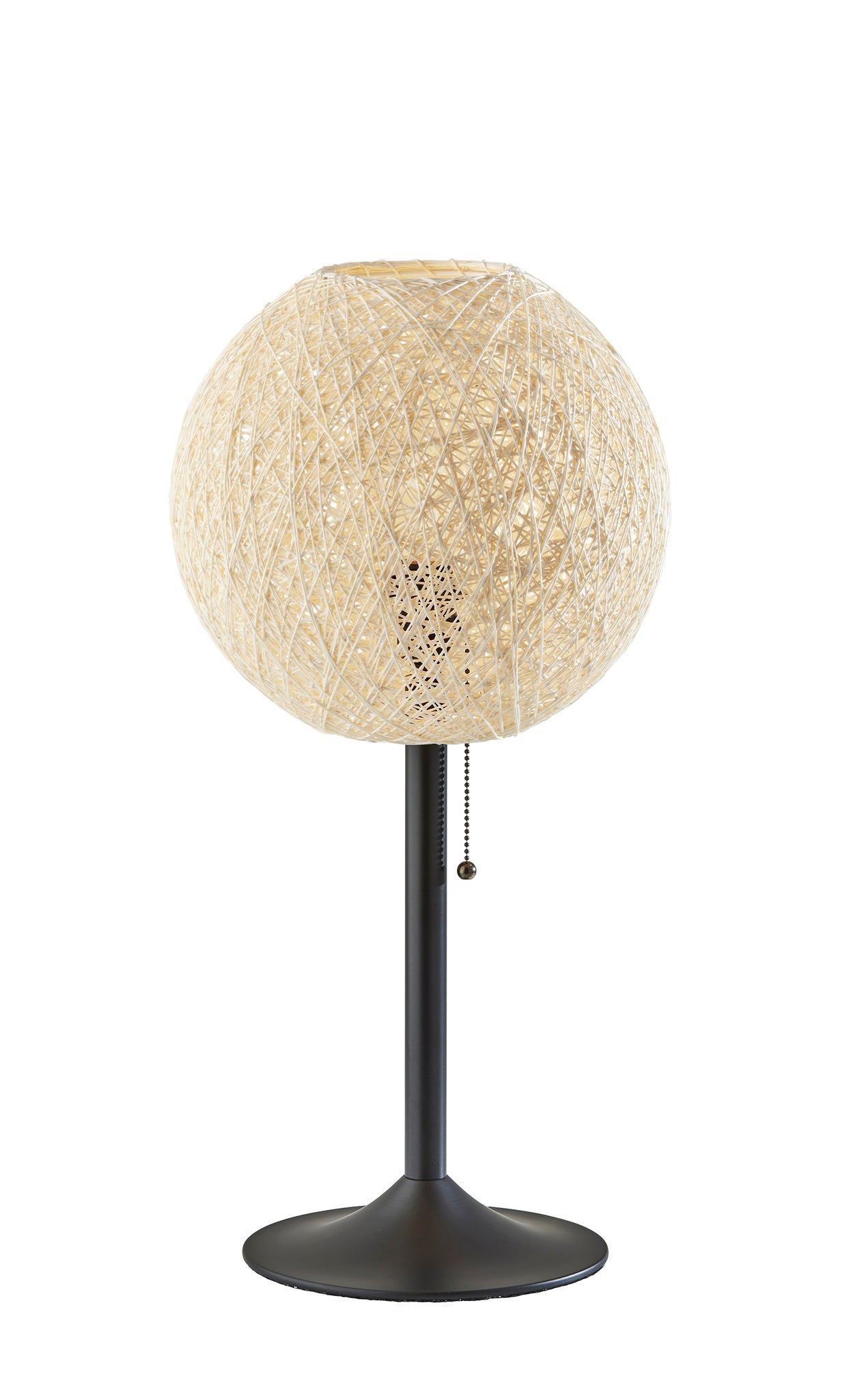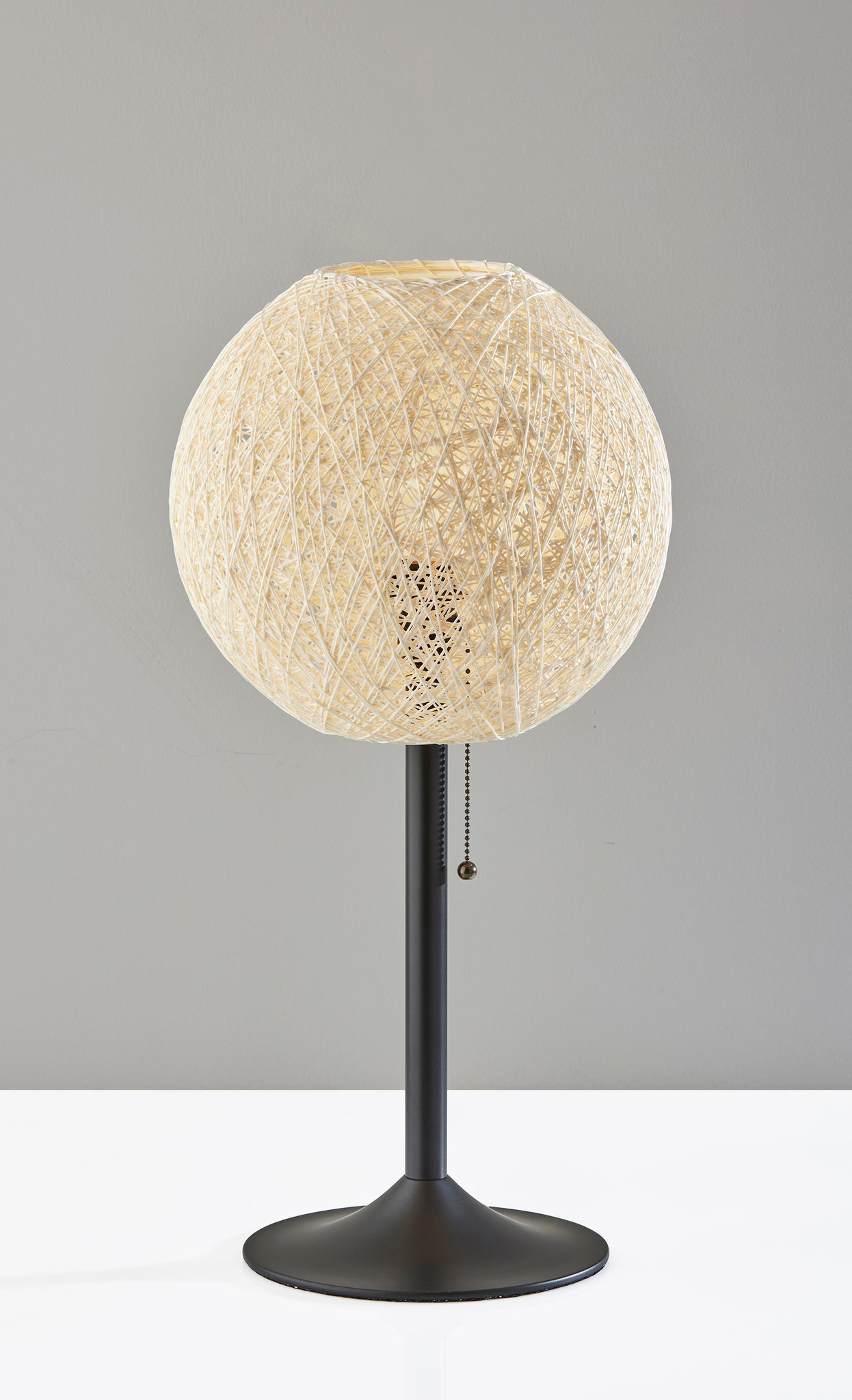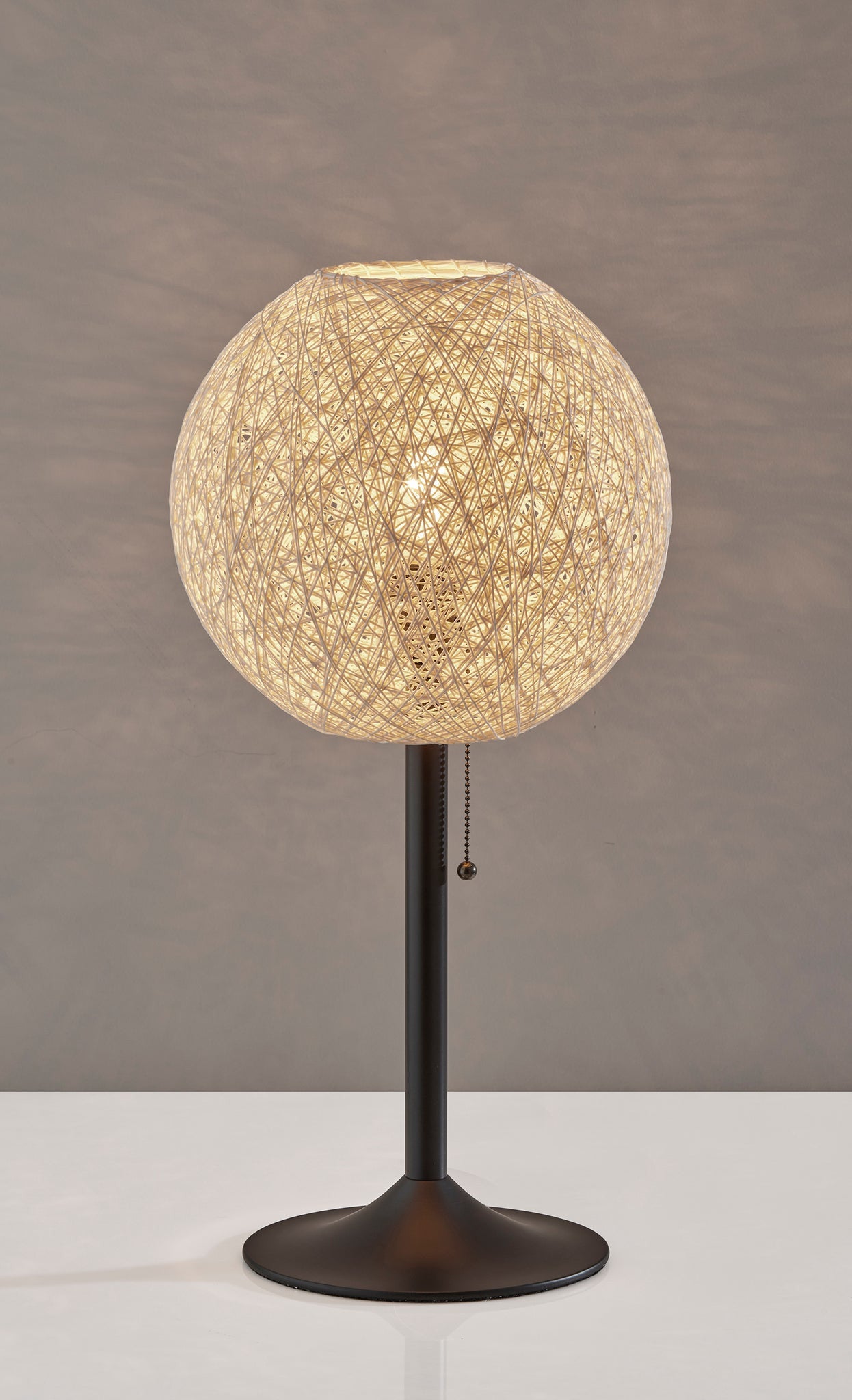 - Modern table lamp with an antiqued bronze base and off white globe shade.