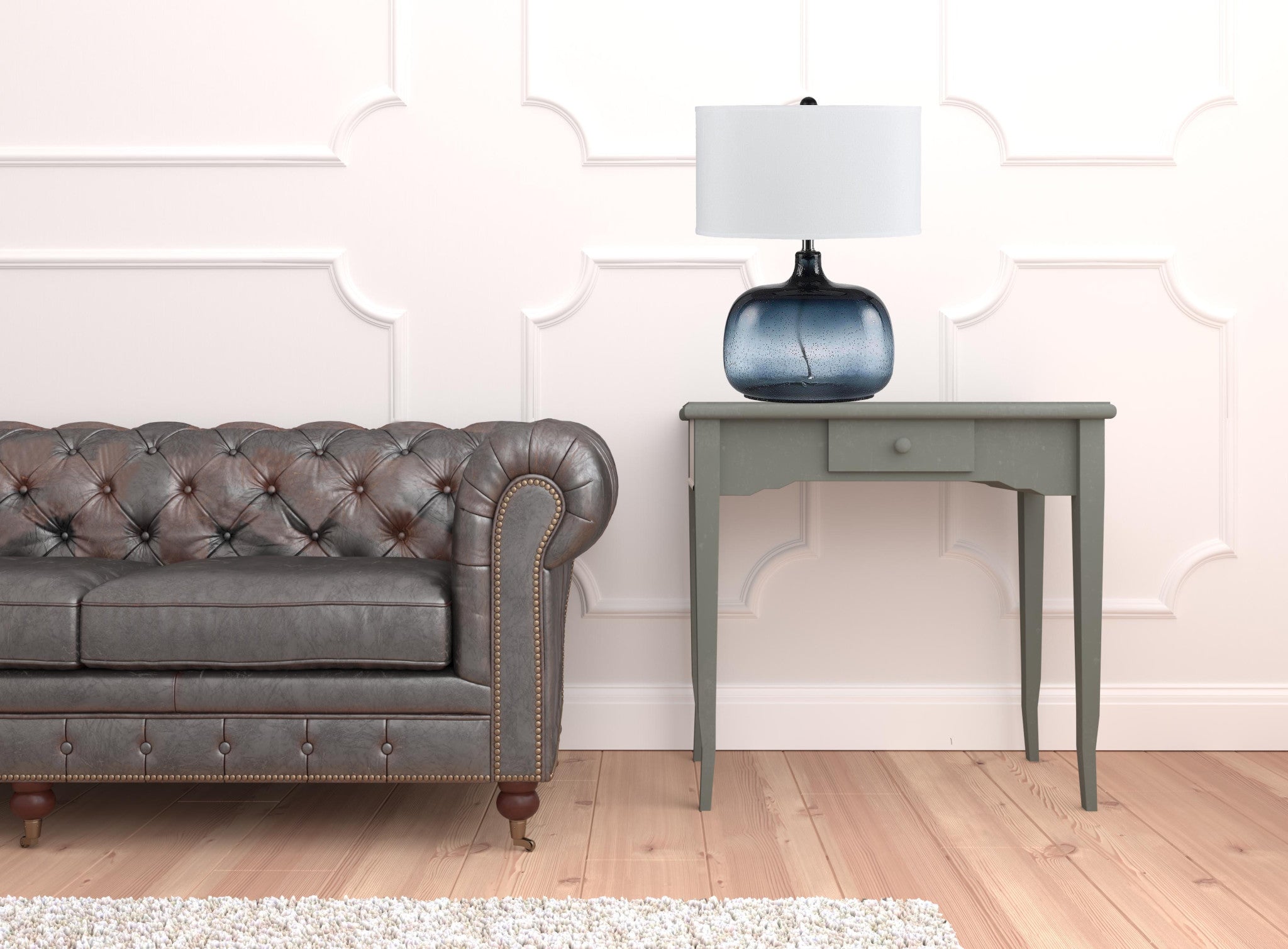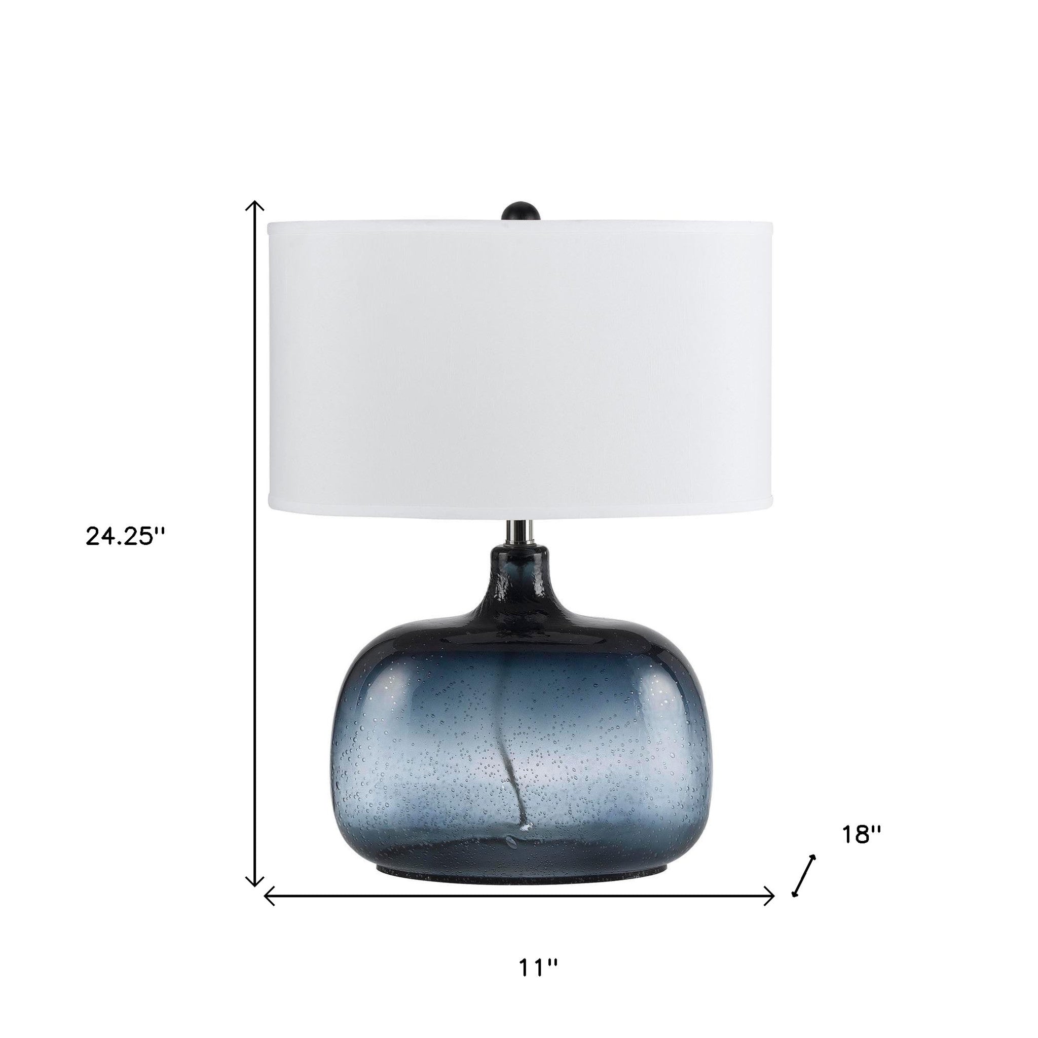 - Comes complete with a translucent blue seeded glass body and white fabric shade for a fresh, clean, and modern look.