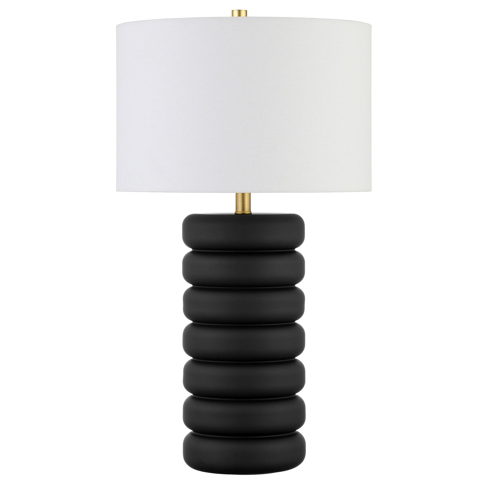 - Modern table lamp with a sleek black ceramic base and a stylish gold and white shade.
