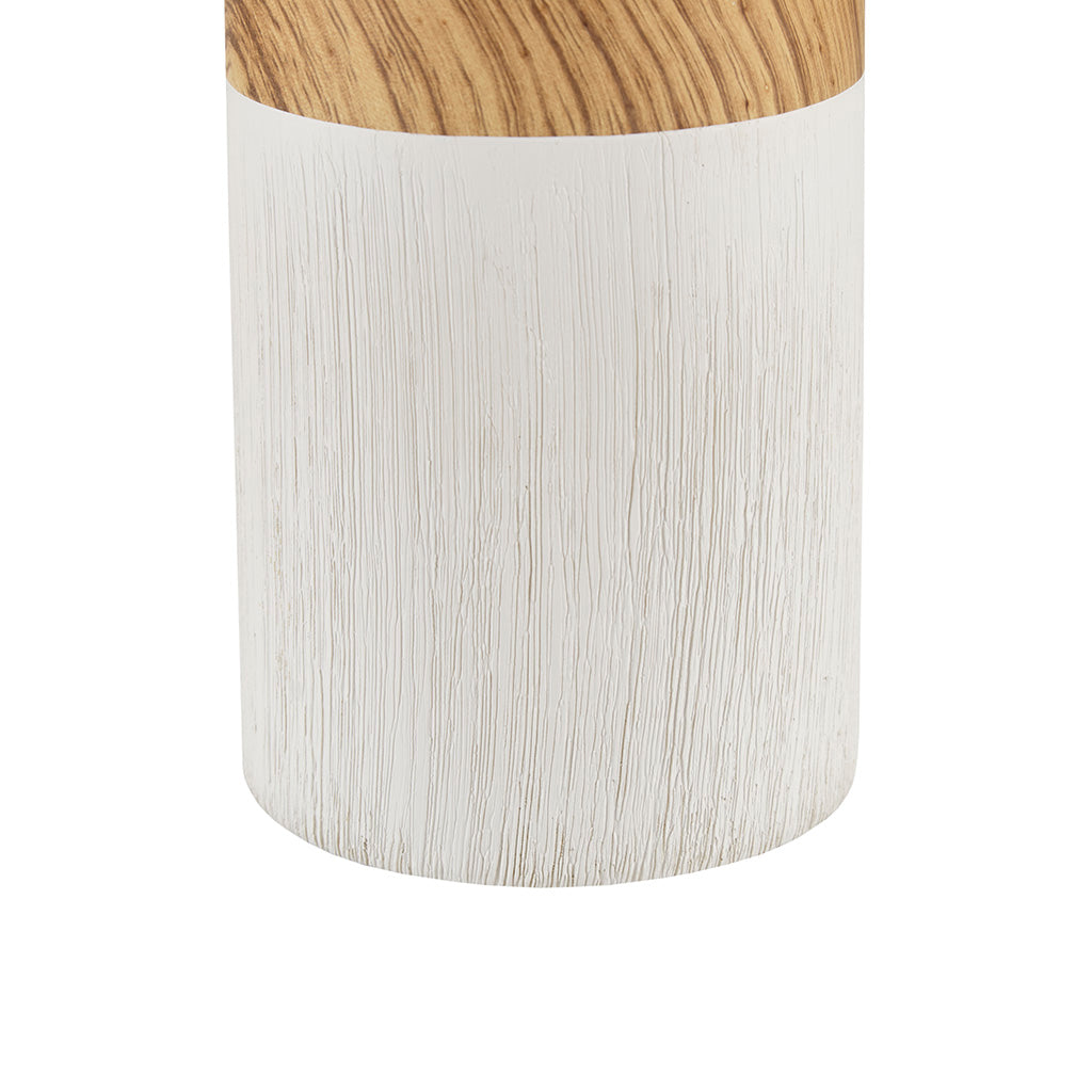 Bring modern warmth and sculptural interest to any room with this textured ceramic table lamp. Its two-tone round base blends clean white with a brown wood-grain pattern for a contemporary, natural look, while the drum shade diffuses light for a soft, inviting glow—ideal for living rooms, bedrooms, or office desks.