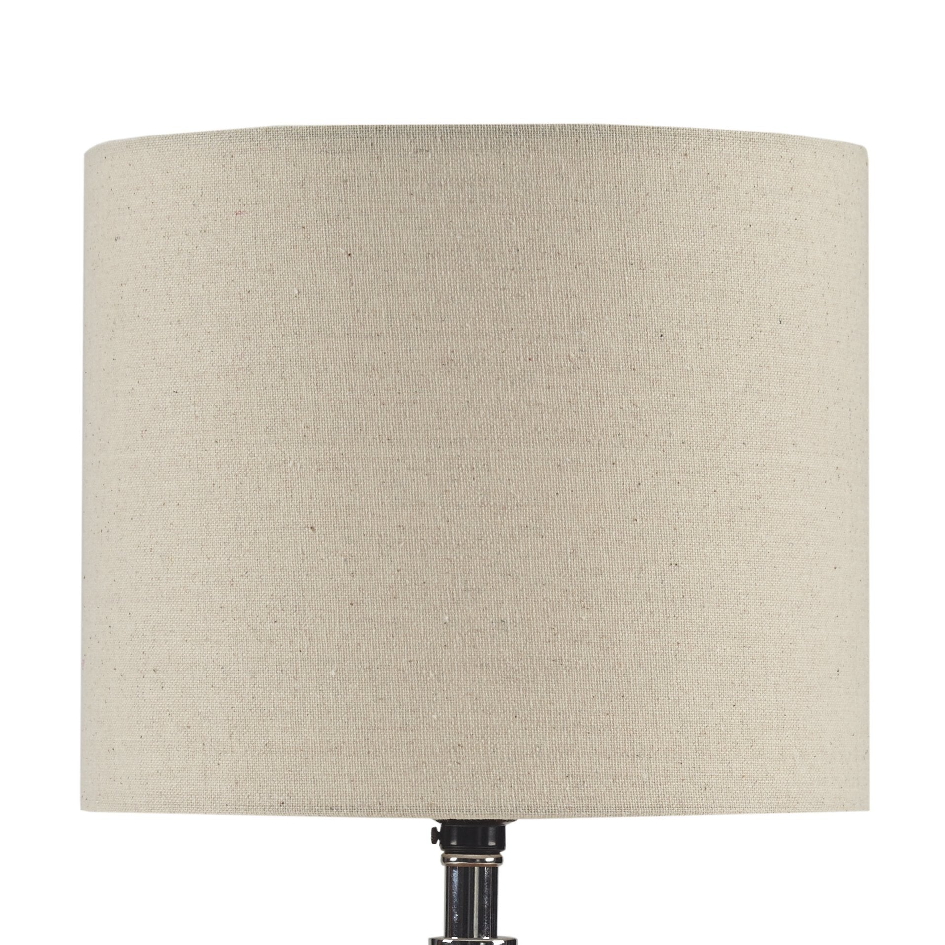 - Shade: Drum-style shade that softly filters light to create warm ambient illumination.