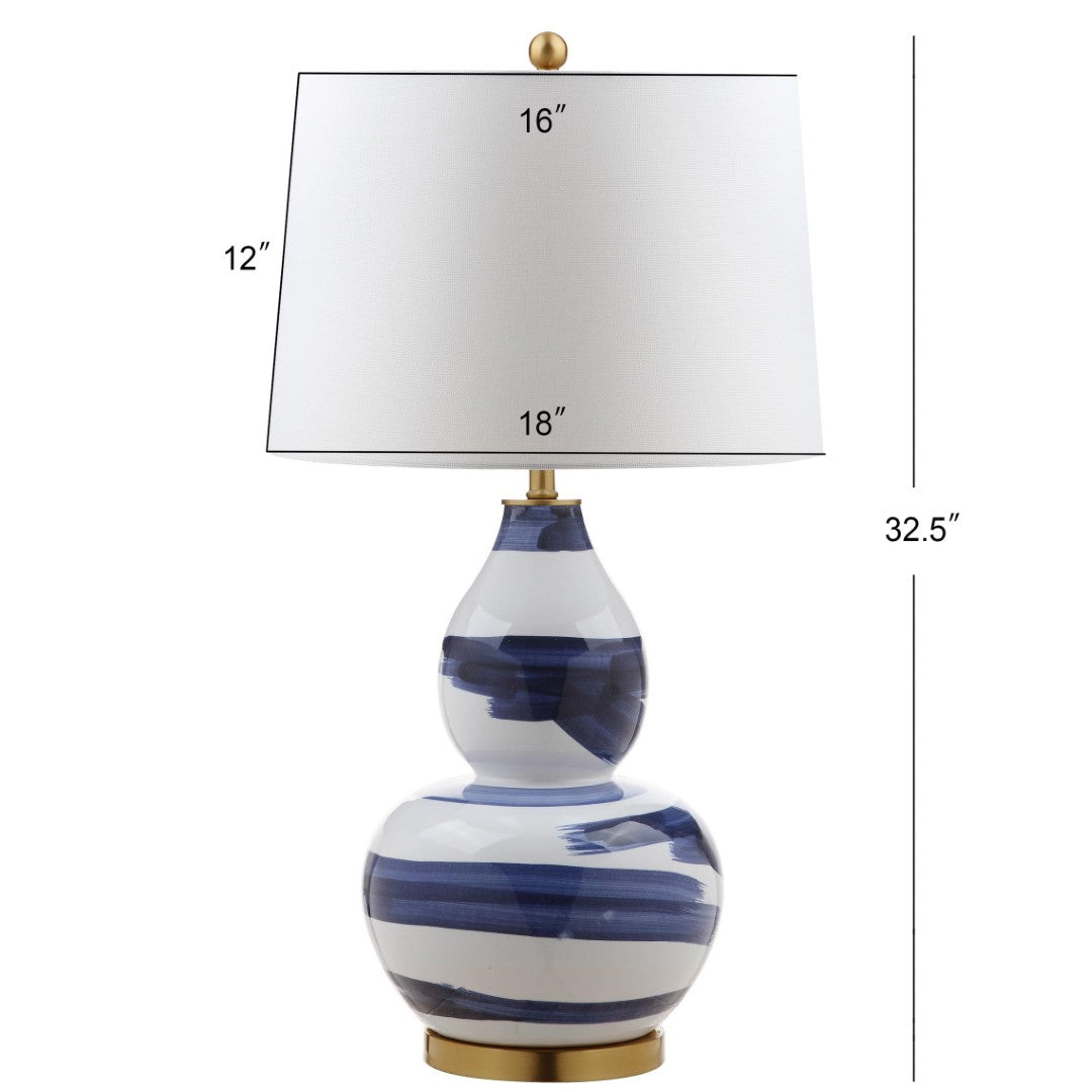 Brighten your space with the Aileen Table Lamp — a refined blend of contemporary lines and classic elegance. Its sculptural ceramic base in rich blue with gold accents creates a striking focal point, while the white linen shade delivers a soft, warm glow that flatters living rooms, bedrooms, and offices alike. Thoughtfully designed to serve as both functional lighting and an artful statement, the Aileen lamp complements a wide range of decor styles from modern to traditional.