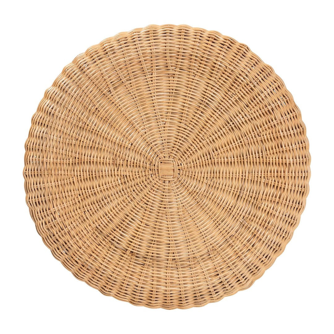 - Design: Round tabletop with a tapered pedestal and scalloped/skirted rattan border for a flowing, coastal-bohemian profile