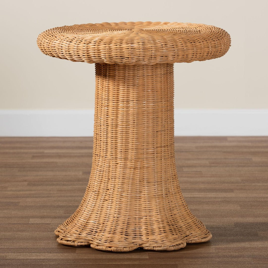 Bring a touch of boho coastal charm to any room with this handwoven Avalon rattan pedestal side table. Crafted in Indonesia from sustainably sourced natural rattan, the table’s scalloped skirted base and round tabletop create an airy, sculptural silhouette that’s equally at home beside a sofa, in a sunroom, or along a hallway. Lightweight yet sturdy, it arrives fully assembled and is designed to showcase decorative accents or serve as a stylish companion surface for seating areas.