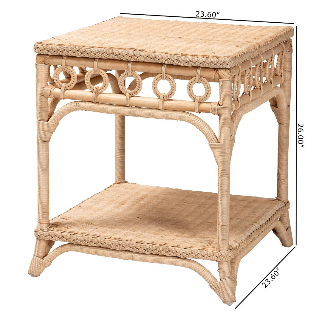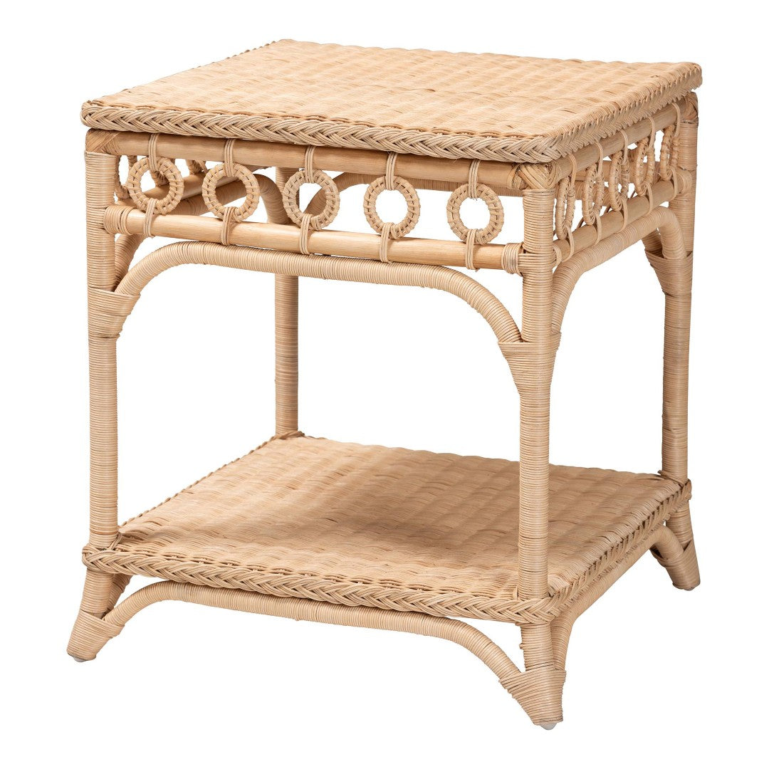 Bring a relaxed coastal vibe and handcrafted charm to your living room or bedroom with this Oxford braided natural rattan end table. Handwoven in Indonesia from sustainably sourced rattan, the table blends lightweight rustic construction with refined decorative details—braided accents, openwork cut-outs, and ring-shaped embellishments—so it functions beautifully as both a practical surface and a stylish focal point. It arrives fully assembled and is designed to showcase décor on the tabletop while keeping larger items organized on the open lower shelf.