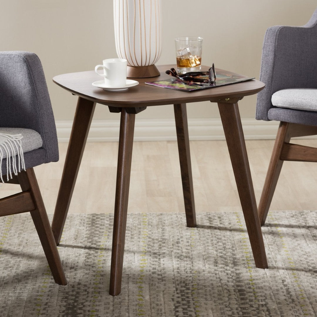 Bring mid-century charm and practical function to your living room or entryway with the Dahlia end table. Clean Scandinavian-inspired lines, tapered legs, and a warm walnut veneer create a refined focal point, while a solid rubberwood frame and engineered joints deliver lasting stability. Ideal for displaying a lamp, vase, or framed photos, this compact square table blends timeless style with everyday utility.