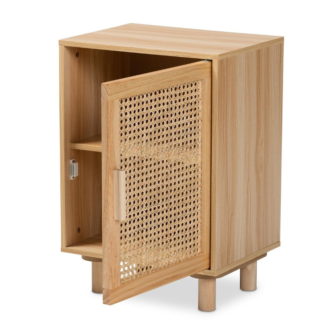 Brighten your living space with the Maclean end table — a mid-century modern piece that blends natural rattan texture with warm brown wood for an airy, refined look. Designed to be both decorative and practical, it offers concealed storage and slender rodlike legs that lift the profile for a light, elegant silhouette.