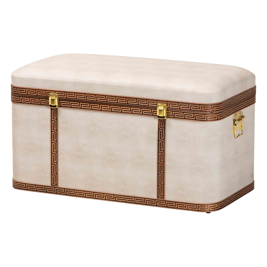 Bring stylish organization to any room with this modern transitional storage trunk. Wrapped in textured beige faux shagreen and accented with carved wood bands and vintage-style metal latches, it blends decorative appeal with practical function. The lift-top reveals generous interior space for storing throws, pillows, seasonal items, or media while arriving fully assembled for immediate use.