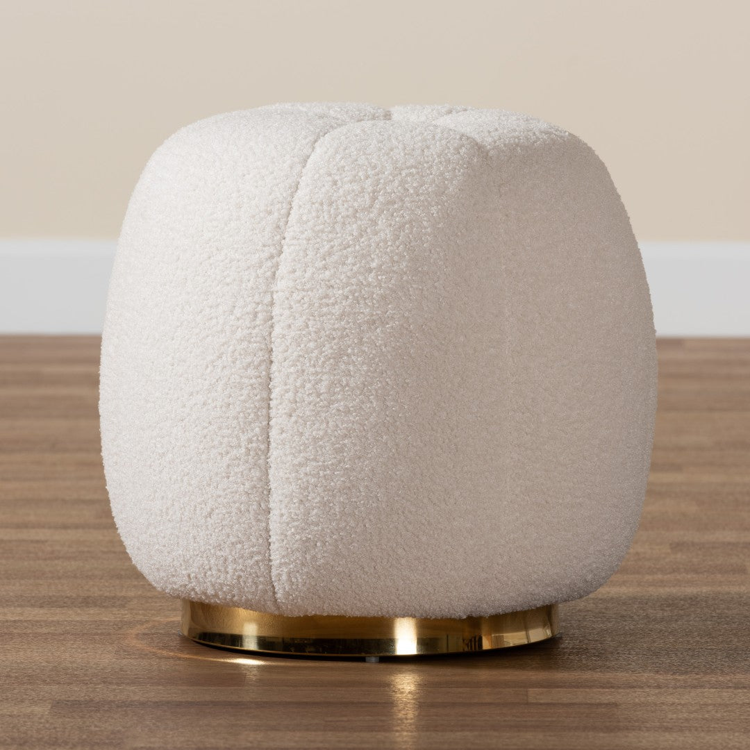 Add a touch of modern glamour to your living space with the Raelynn ottoman — a compact, sculptural piece that blends soft, tactile boucle upholstery with a gleaming gold metal base. Its pumpkin-inspired, button-tufted silhouette reads luxurious yet approachable, making it equally suited as a stylish footrest, an occasional extra seat, or a standout accent in a bedroom or seating area. Fully assembled and built on a sturdy solid wood frame, Raelynn delivers comfort, stability, and instant visual impact.