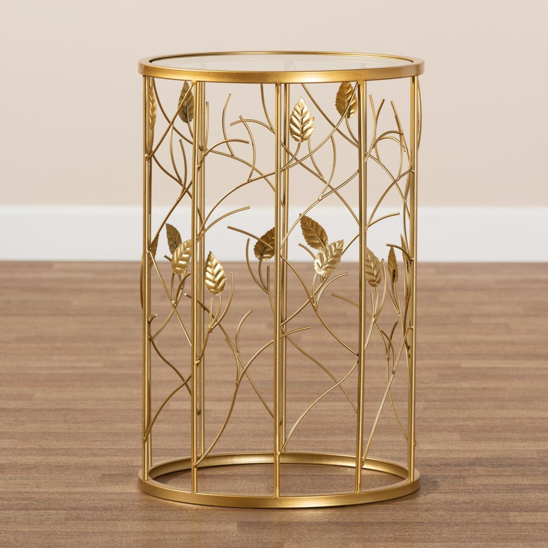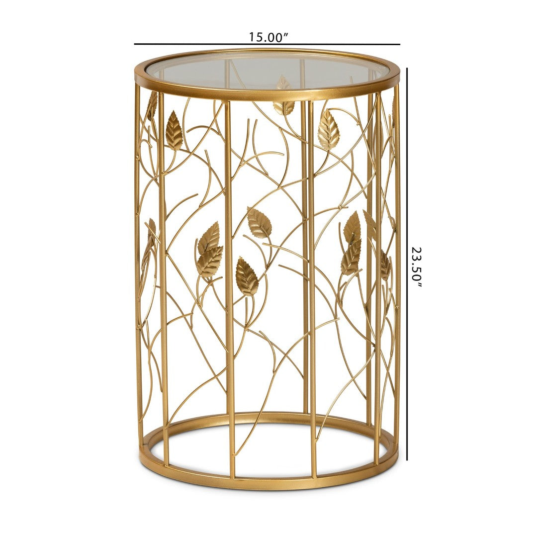 Bring a touch of modern glam and organic elegance to your living area with this striking accent end table. The Anaya pairs a brushed gold metal frame with a clear circular glass top, creating a light, airy silhouette that complements contemporary, transitional, and glam interiors. Its sculptural vine-and-leaf base reflects light and adds visual interest without overwhelming small spaces—ideal for beside a sofa, chair, or as a standalone decorative piece.