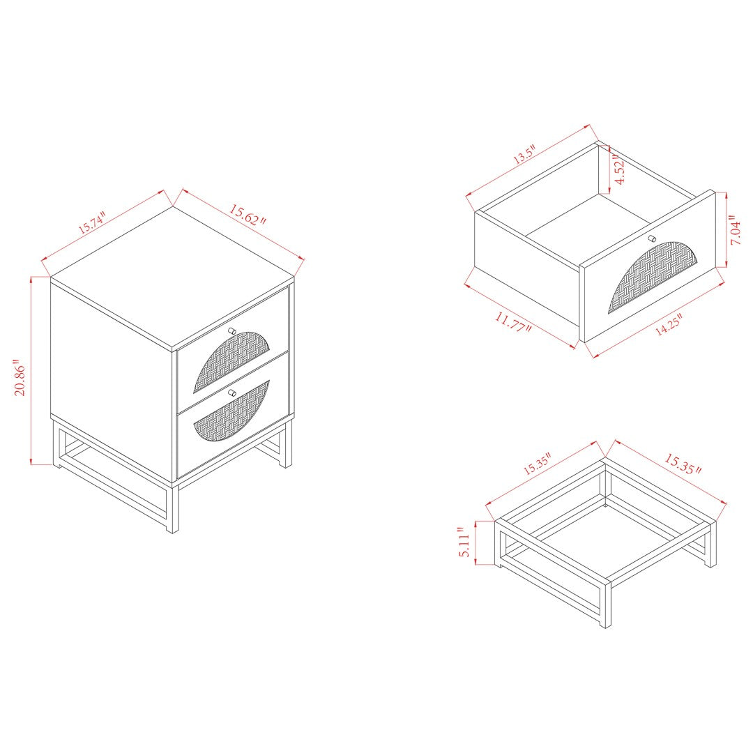 - Dimensions: Overall 20.90" H x 15.70" W x 15.70" D; Legs 5.10" H; Drawer (each) 13.50" W x 11.77" D x 4.52" H