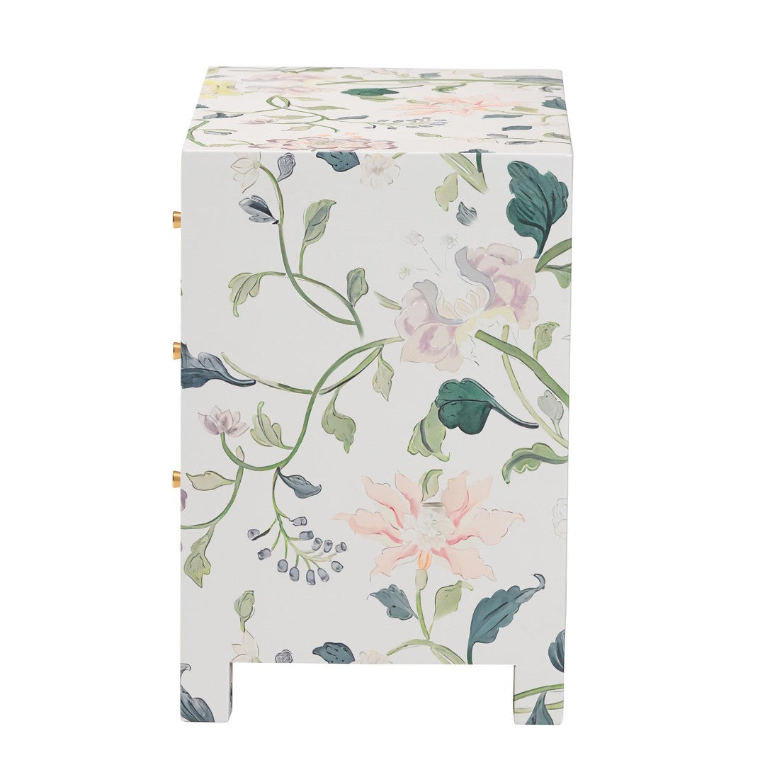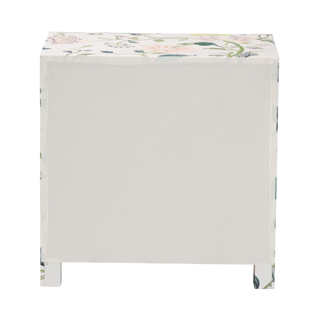 Elevate your living space with a polished, artful accent that blends decorative flair and everyday functionality. This three-drawer end table features a floral-upholstered faux leather finish, sturdy engineered-wood construction, and refined metal accents—designed to bring organized storage and visual interest to a bedroom, living room, or hallway without sacrificing style.