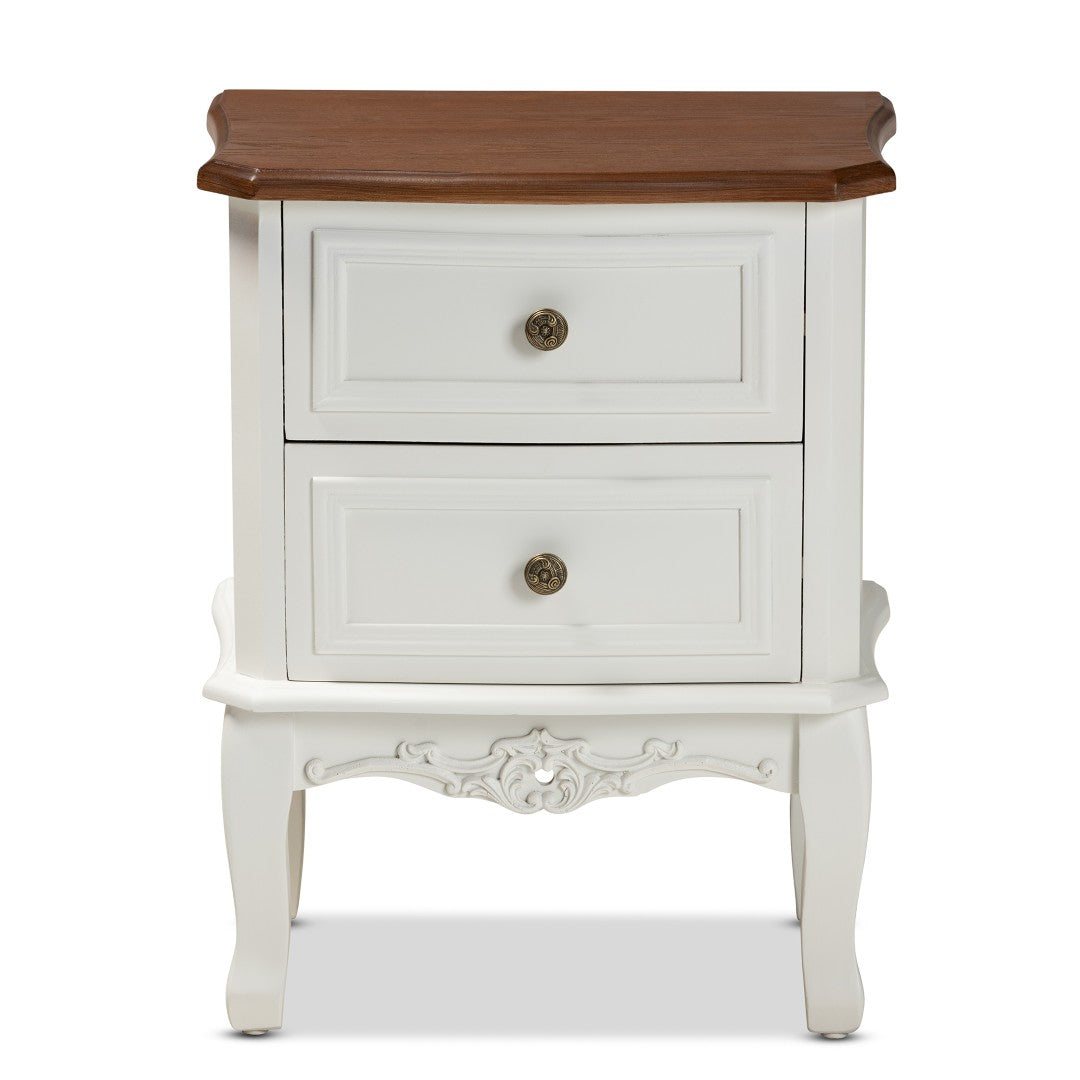 Add classic French charm and practical storage to your living room or bedroom with this elegantly crafted 2-drawer end table. The Darlene combines traditional design elements—cabriole legs, inset paneled drawers and floral brass knobs—with a two-tone white and cherry brown finish to create a refined focal point that pairs easily with both vintage and modern decor. Fully assembled and thoughtfully proportioned, it provides display space on top plus concealed and open storage for everyday essentials.