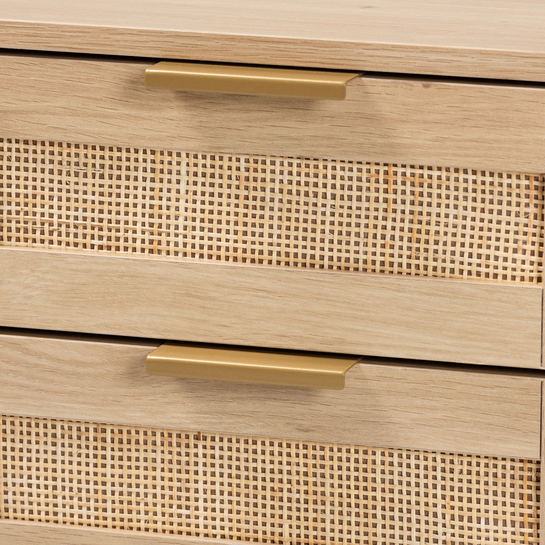Elevate your living space with the Dewitt end table — a Japandi-inspired blend of minimalist form and natural warmth. Thoughtfully designed to balance function and style, this piece pairs a sturdy metal base with a light brown finished wood frame and woven rattan drawer fronts for a refined, layered look. Ideal for small spaces, the Dewitt brings subtle glamour through gold-toned metal accents while providing practical storage and stable support.