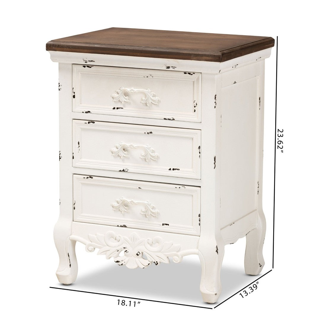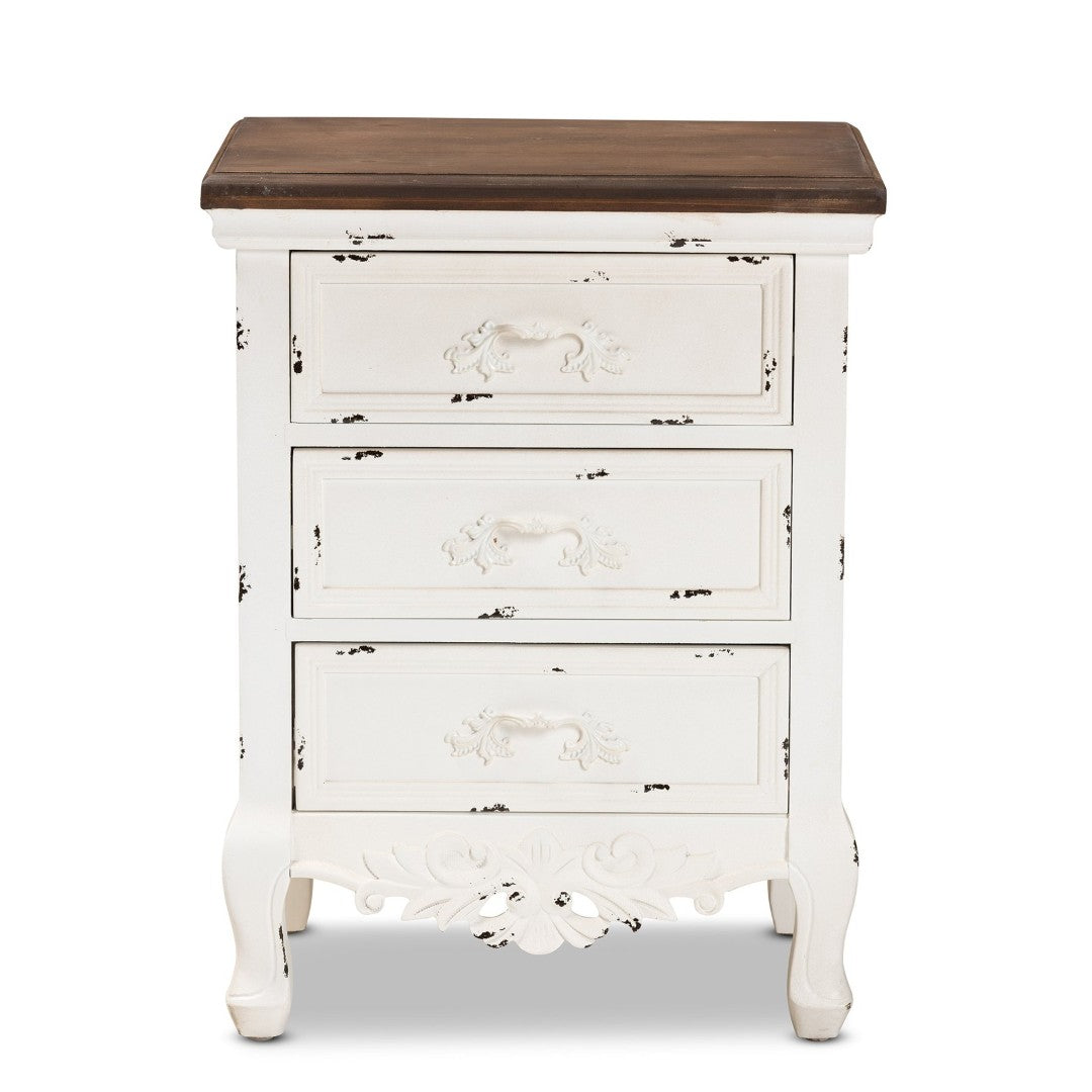Introduce timeless mid-century charm and practical storage to your living area with this elegant three-drawer end table. Crafted from solid firwood with refined floral molding and cabriole legs, it pairs antique-white drawer fronts with walnut-brown finishes for a classic two-tone look that complements both traditional and transitional interiors. Fully assembled and built for everyday use, this piece offers graceful styling without sacrificing functionality.