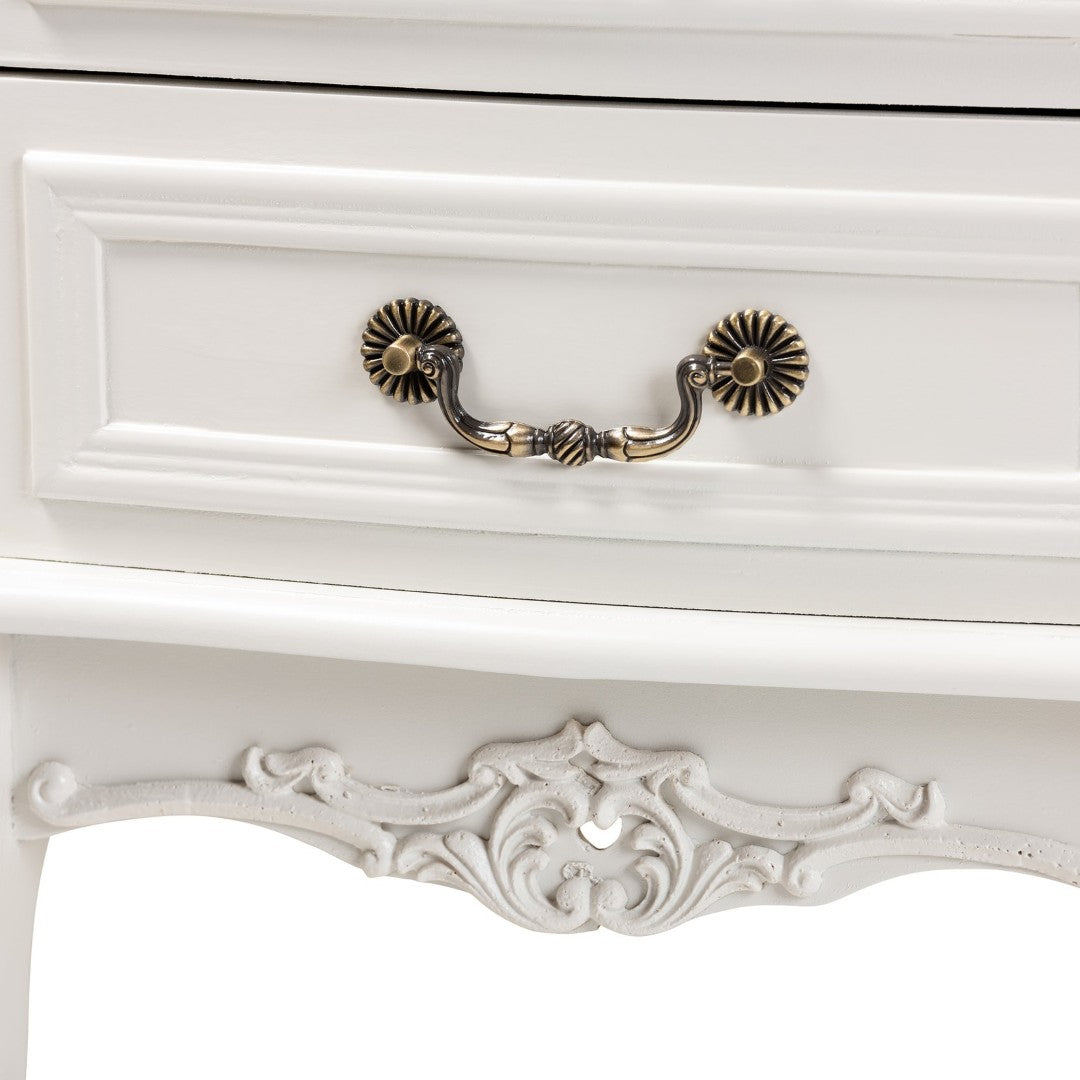 Bring timeless French country charm to your living space with this Gabrielle 3-drawer end table. Its classic white finish, floral moldings and cabriole legs create an elegant focal point while offering practical storage for remotes, books and everyday essentials. Designed to complement traditional and provincial interiors, the fully assembled piece blends decorative detail with durable construction for immediate use.