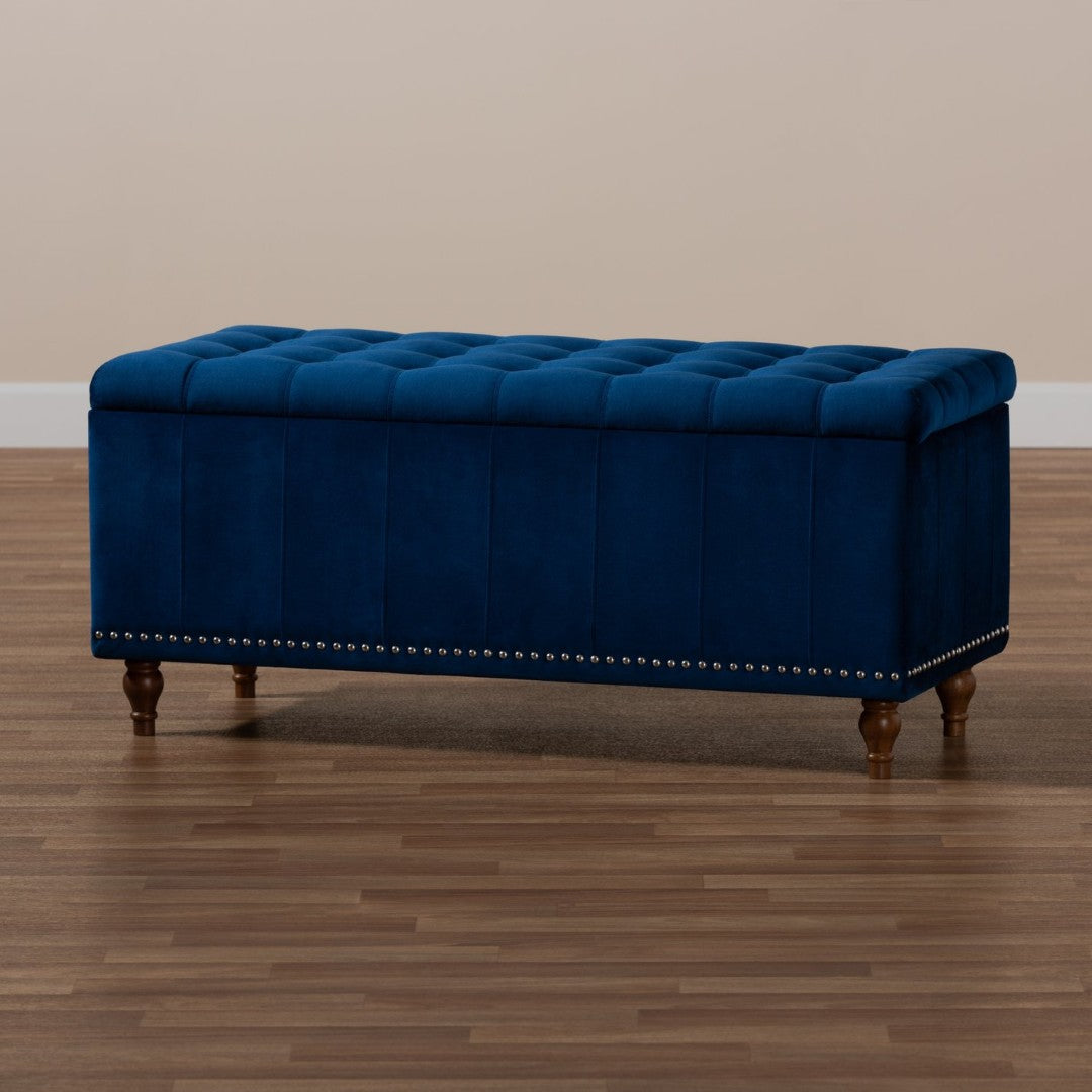 Add luxurious storage and seating to your bedroom, entryway, or living room with this elegant navy blue velvet upholstered storage bench. The Kaylee blends modern details—like silver nailhead trim and grid stitching—with classic button tufting and turned walnut-finish legs, offering both refined style and practical organization. Padded for comfortable seating and thoughtfully constructed from rubberwood and engineered wood, it’s a versatile piece that conceals ample storage for blankets, linens, and seasonal accessories.