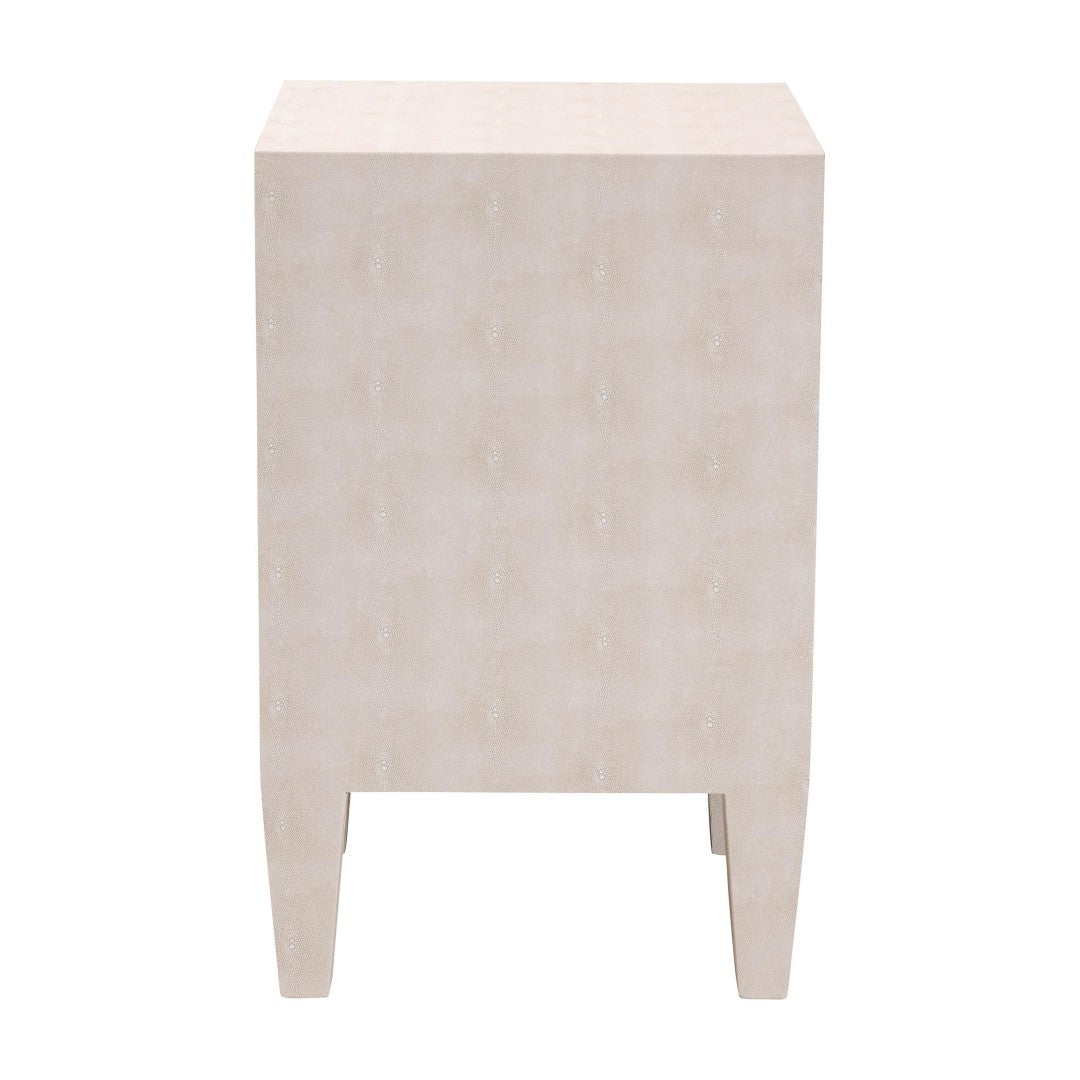 Introduce a touch of modern glamour to your living space with the Leyna end table — a compact, sculptural accent that blends tactile interest and practical storage. Wrapped in high-quality faux shagreen, this piece delivers a rich granular texture and neutral beige tone that complements contemporary and transitional interiors. Designed for everyday use, the Leyna combines a sleek silhouette, tapered legs for stability, and three smooth-gliding drawers that keep essentials neatly stowed while preserving the tabletop for display or daily convenience.