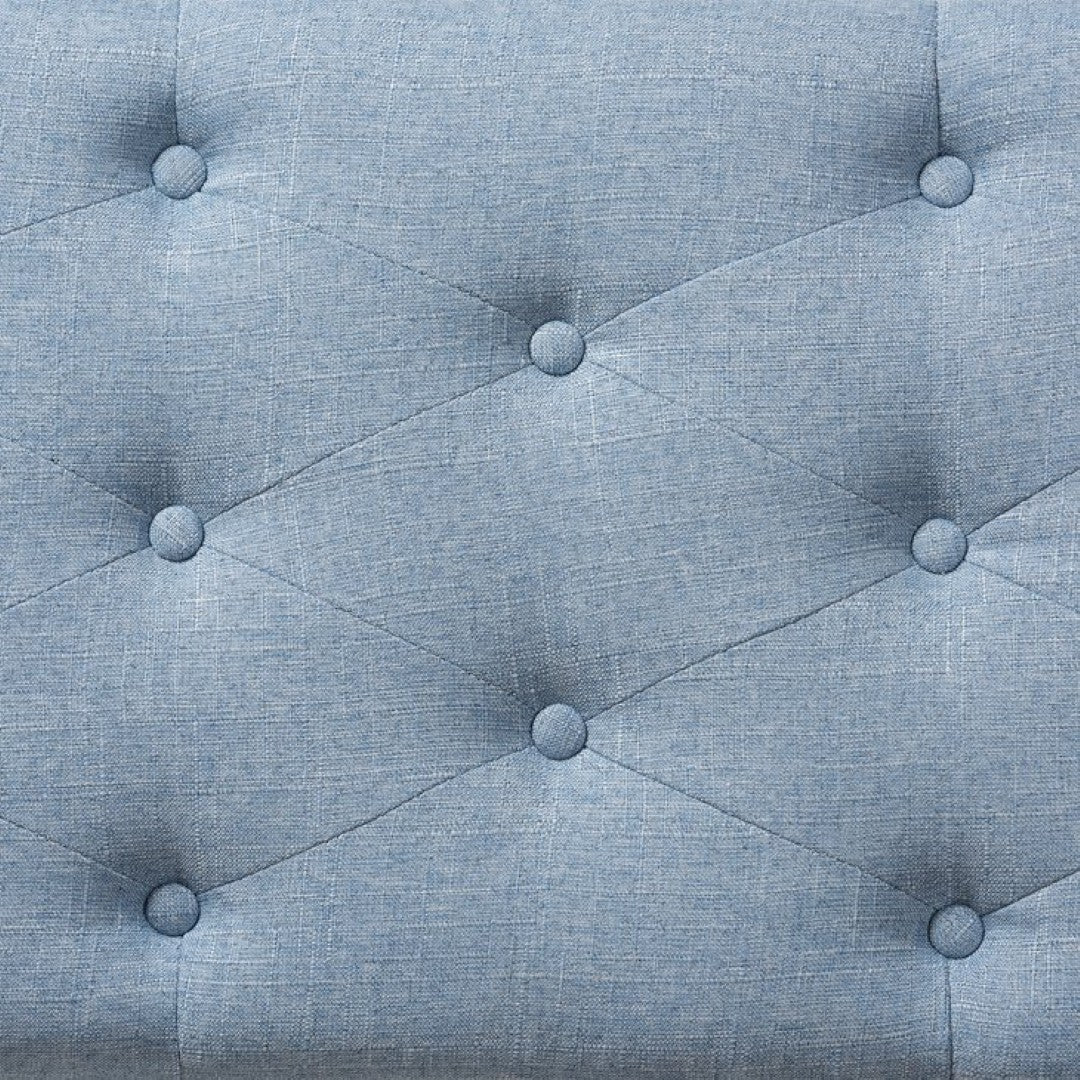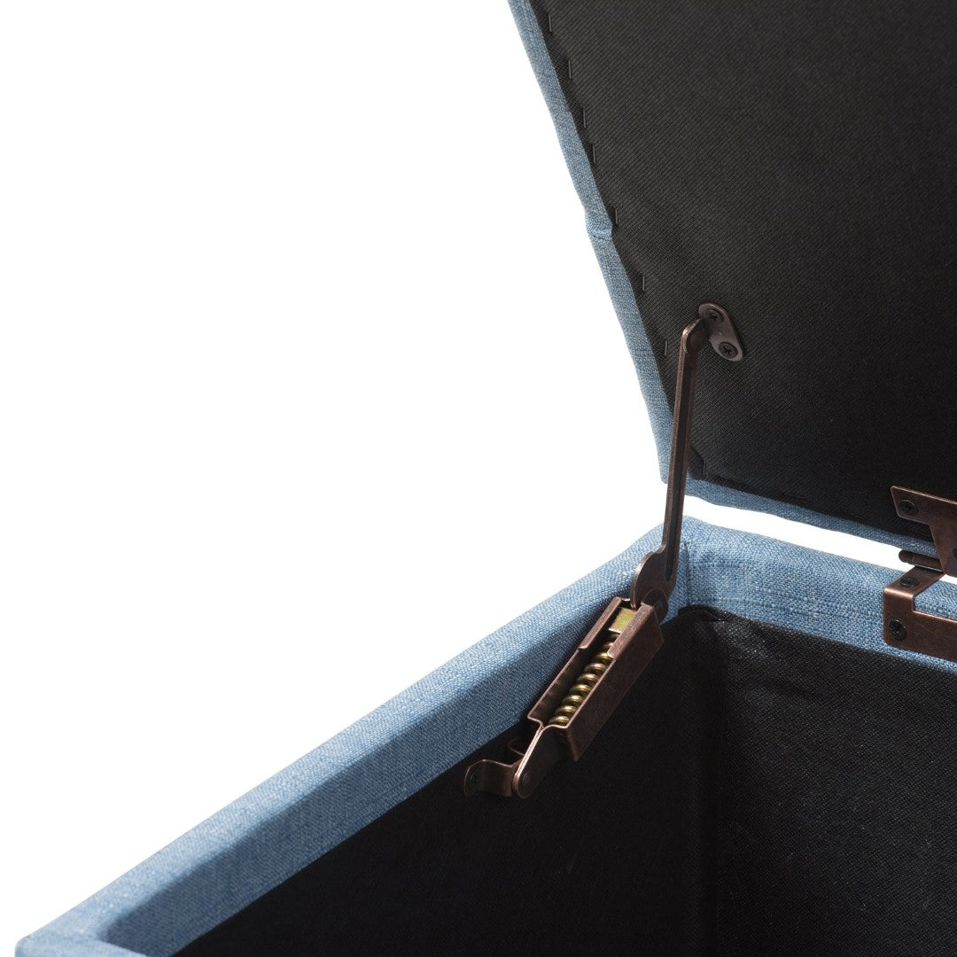 Add a touch of modern softness and smart storage to any room with this light blue upholstered storage ottoman. Designed for everyday use, it offers a foam-padded, button-tufted top for comfortable seating while concealing a roomy compartment ideal for linens, shoes, toys, or seasonal items. Its neutral contemporary styling and compact footprint make it versatile for bedrooms, entryways, guest rooms, or living areas.